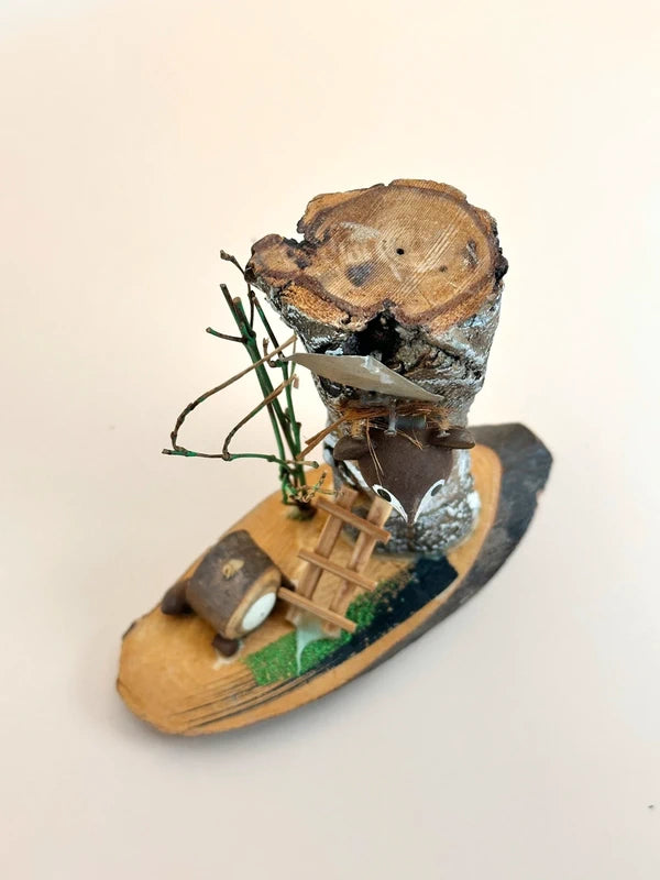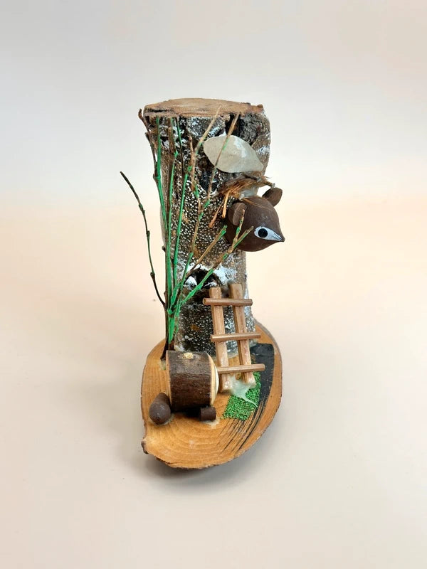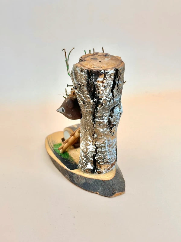 A vintage Japanese folk craft piece hails from the scenic Mt. Takao (高尾山), a beloved spiritual and natural retreat west of Tokyo. Handcrafted from natural wood and forest materials, the piece features a delightful scene of a small woodland tanuki peeking from the hollow of a birch-like log.