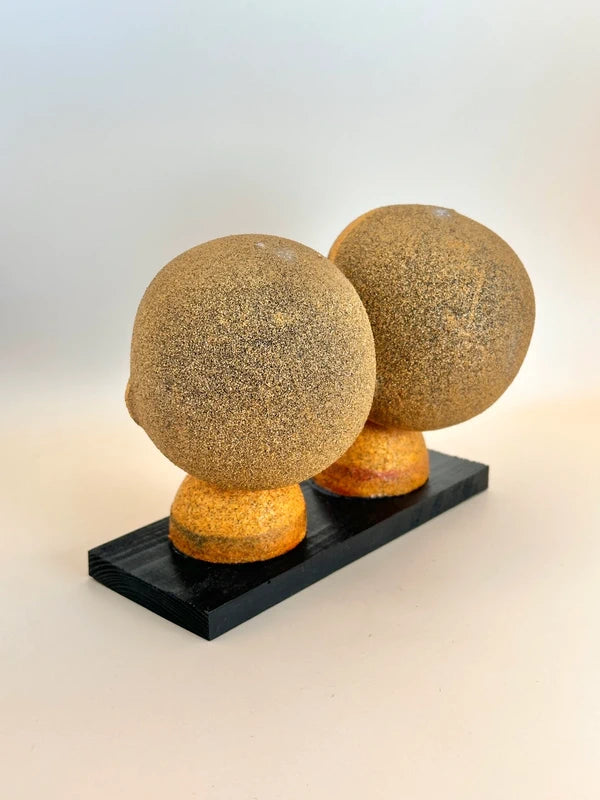 The minimalist facial expressions and round forms give them a modern folk charm, while the sandy finish adds a tactile connection to the local landscape. Set on a black wooden base and accompanied by their original striped box, these dolls are a playful and nostalgic reminder of travel through Japan’s scenic San’in region.