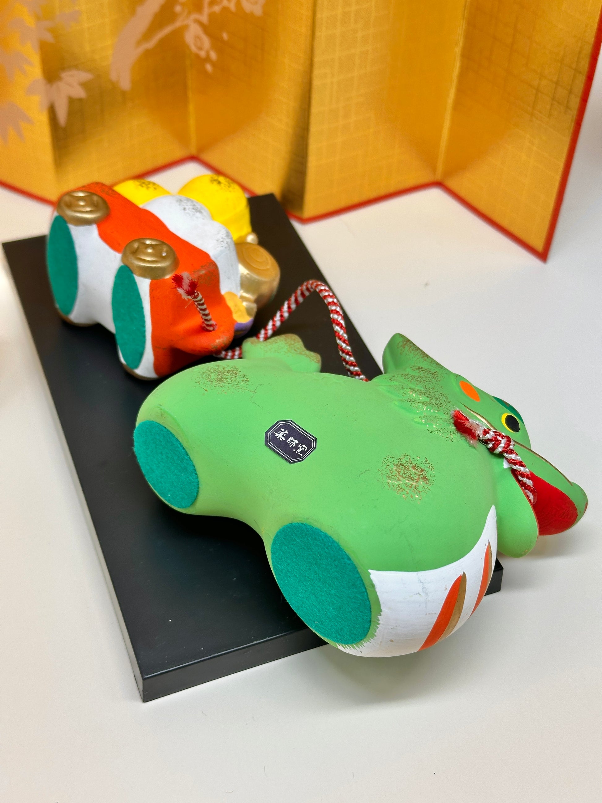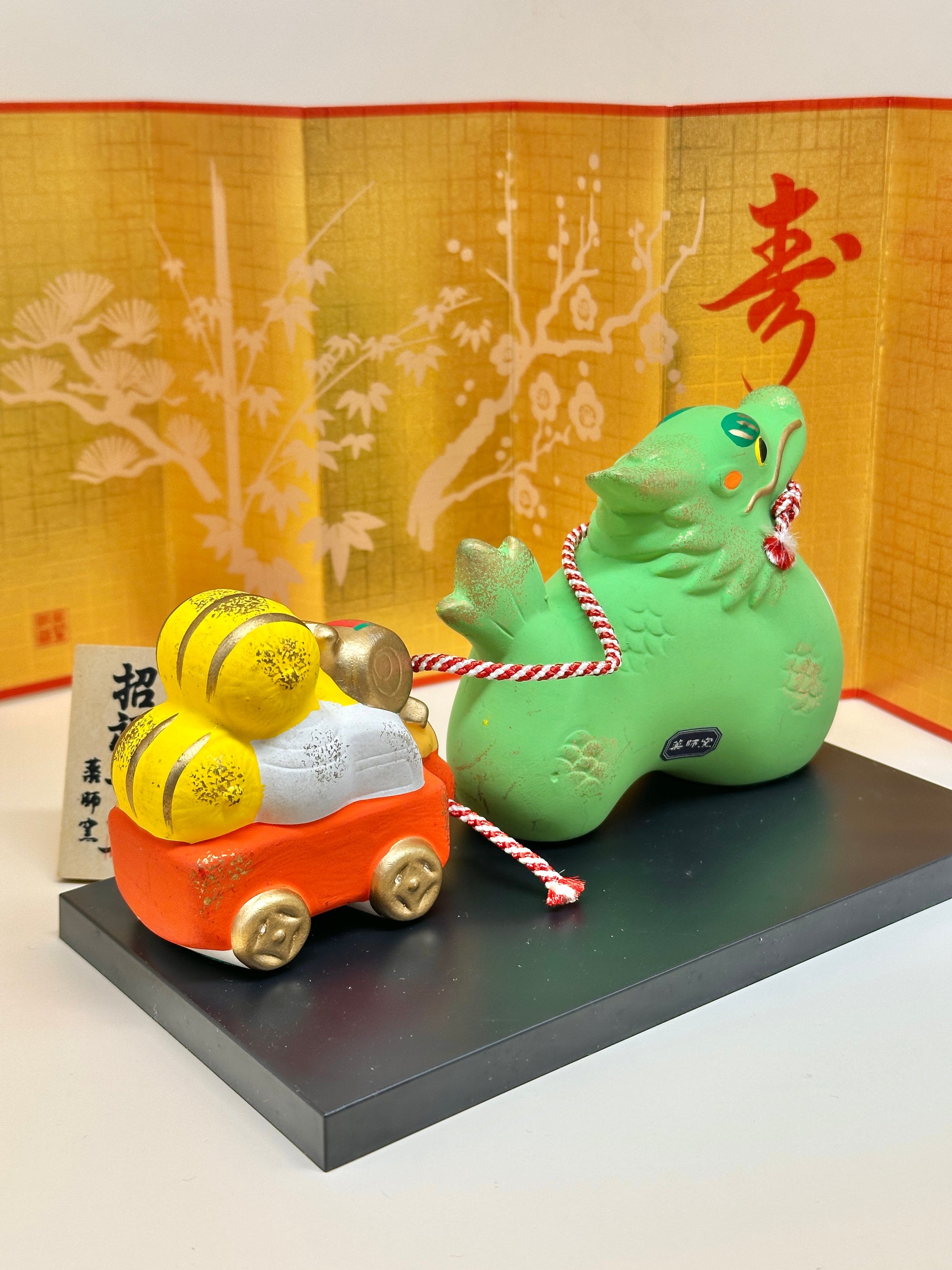 This vibrant ceramic set features a friendly green dragon, symbolizing rising fortune, protection, and vitality. The dragon pulls a miniature treasure cart (宝車), brimming with gold-toned orbs of luck and prosperity — a nod to the mythical creature's association with rain, abundance, and celestial power.