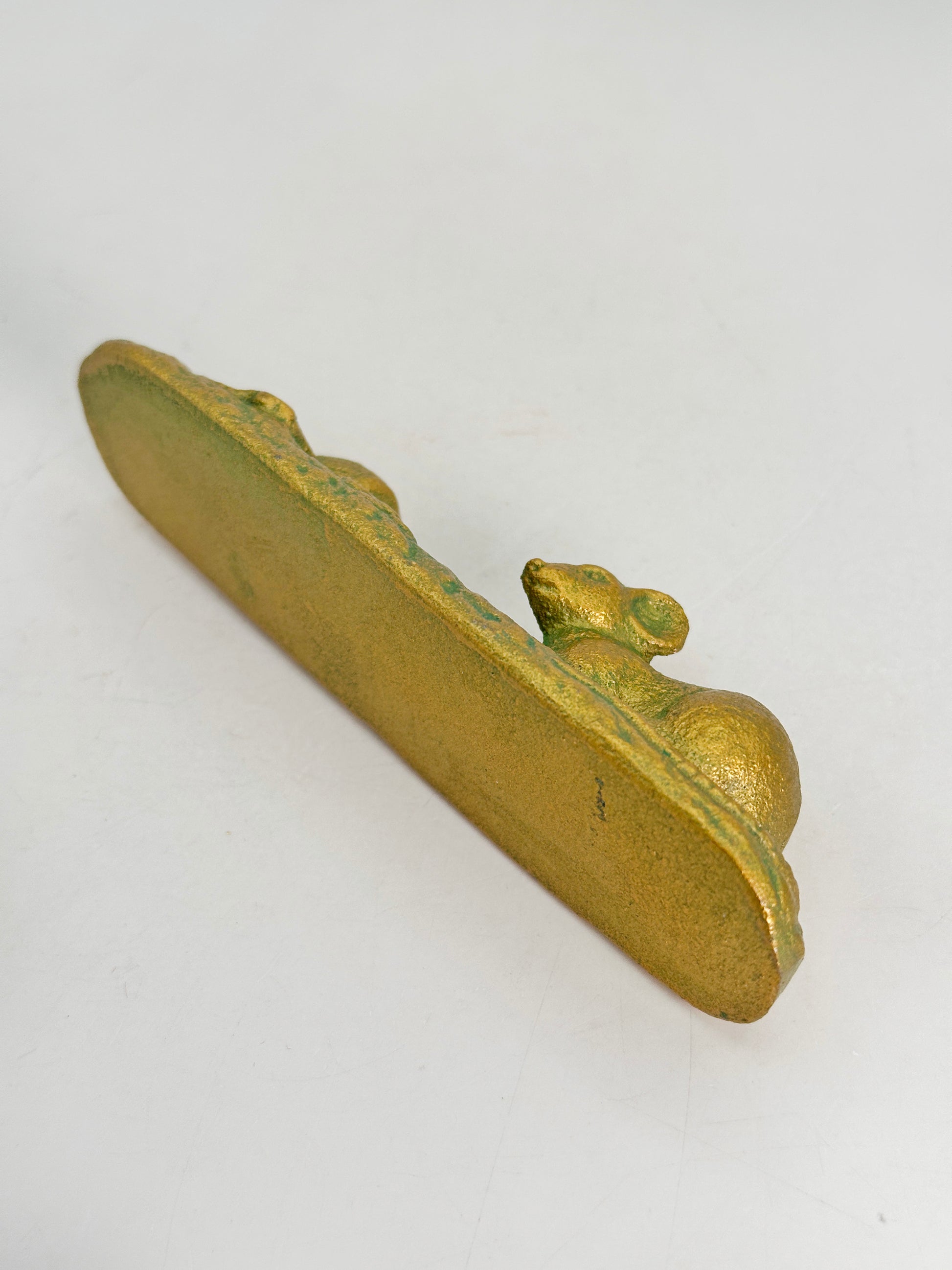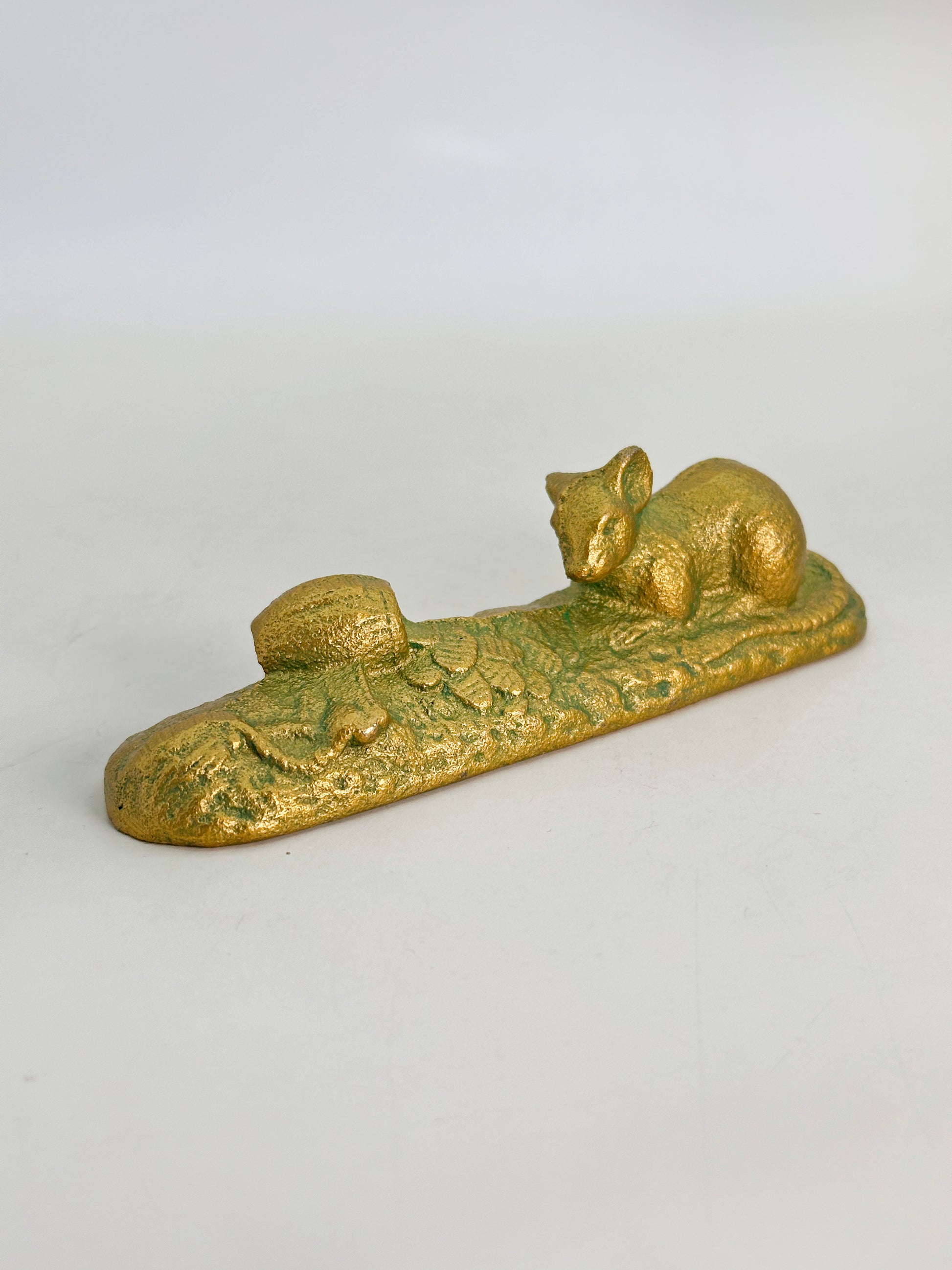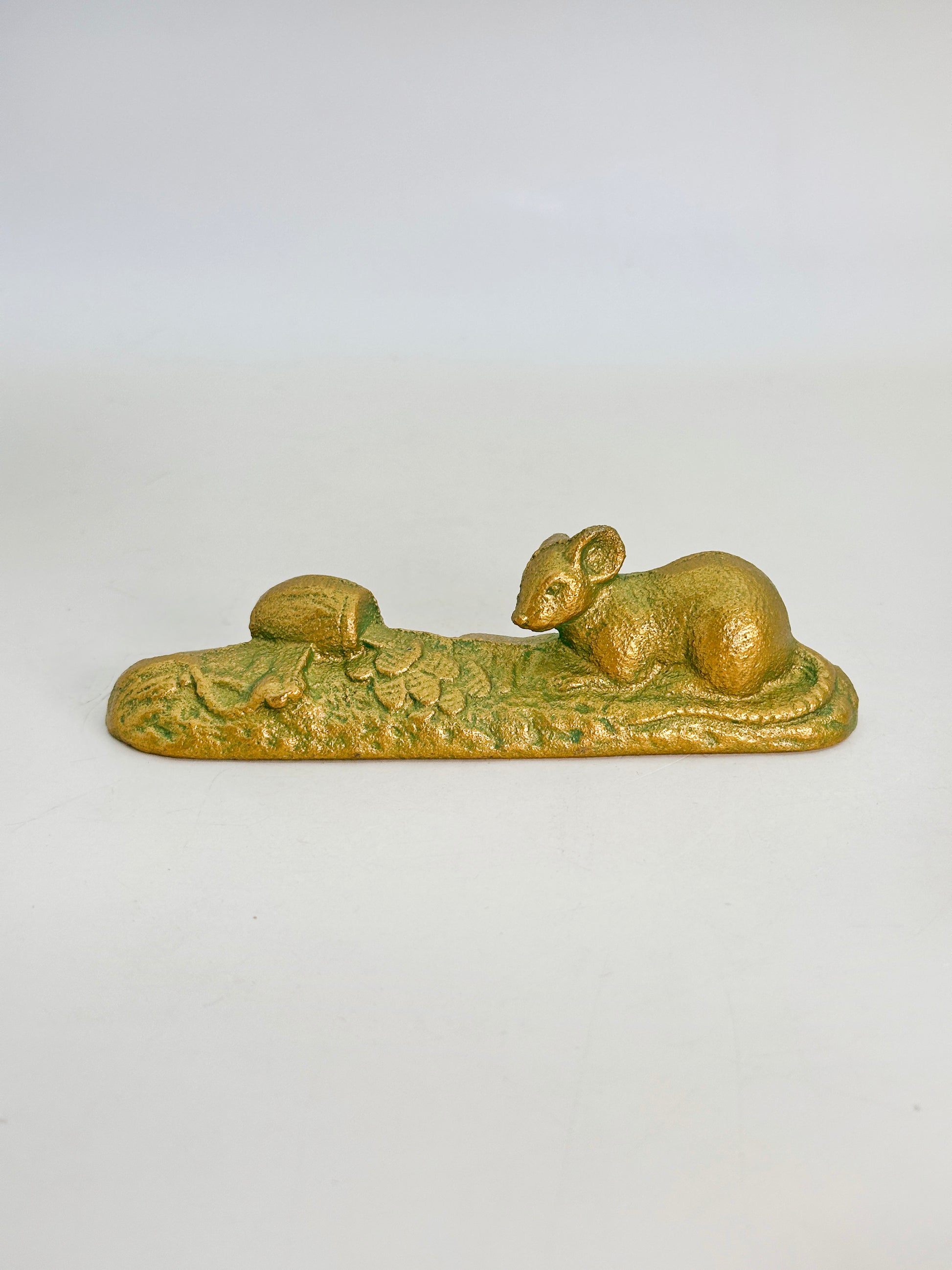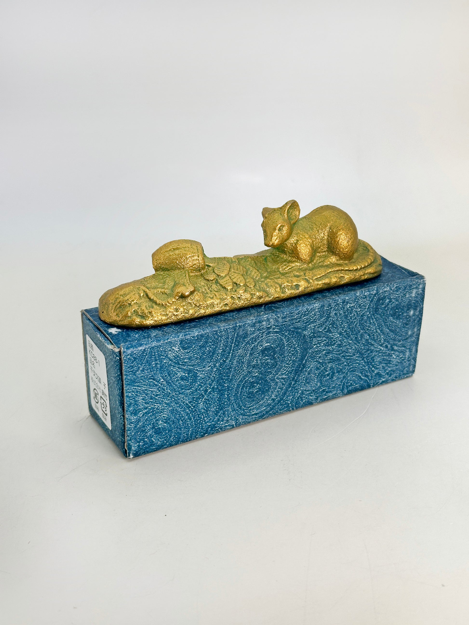 This vintage Japanese cast iron paperweight features a charming composition of a rat (nezumi) resting beside a treasure mallet by Kuretake Co., Ltd. (株式会社呉竹)—a historic company known for its heritage in traditional Japanese crafts and calligraphy supplies—this piece blends symbolism, function, and artistry in a compact design.