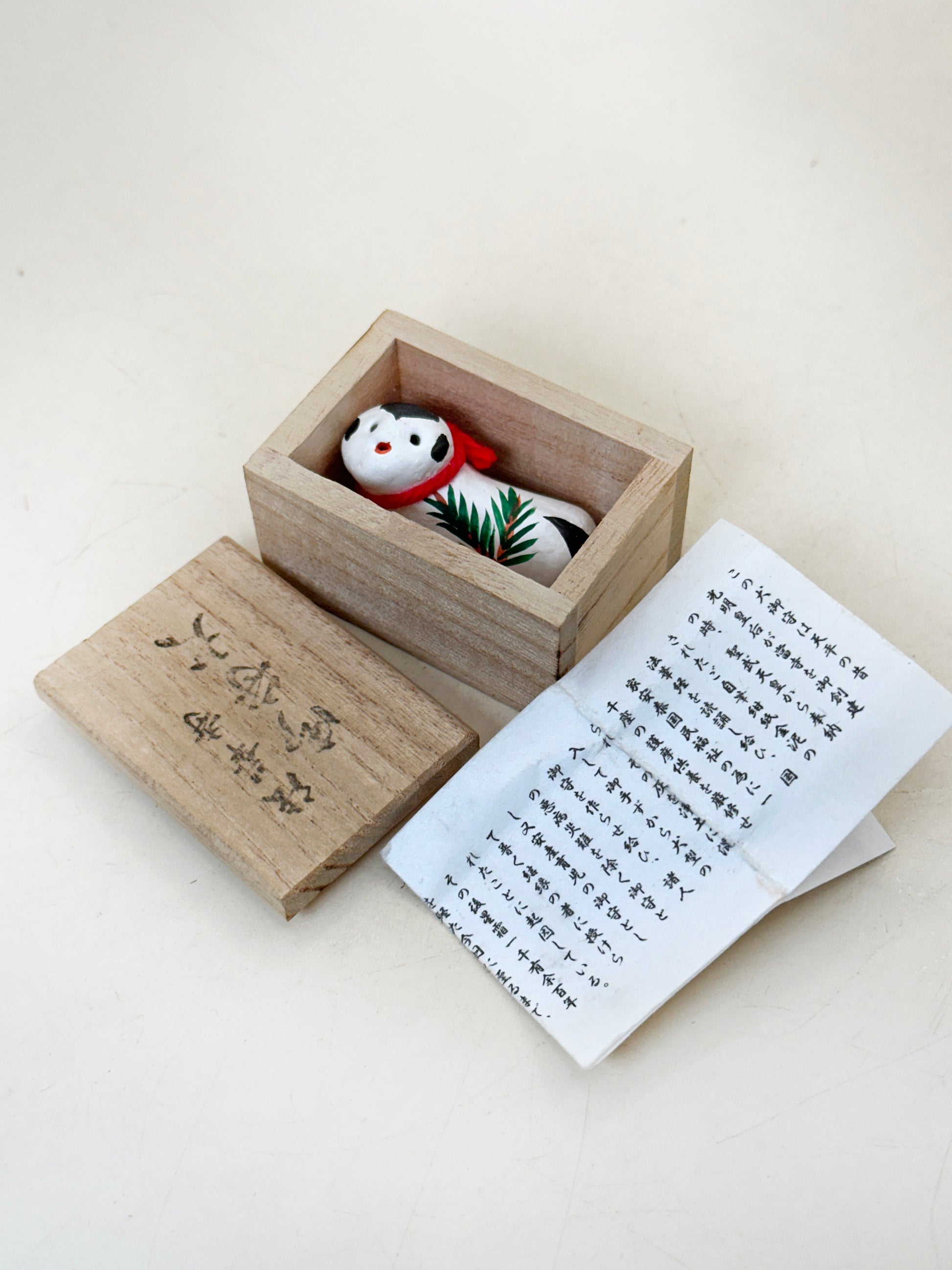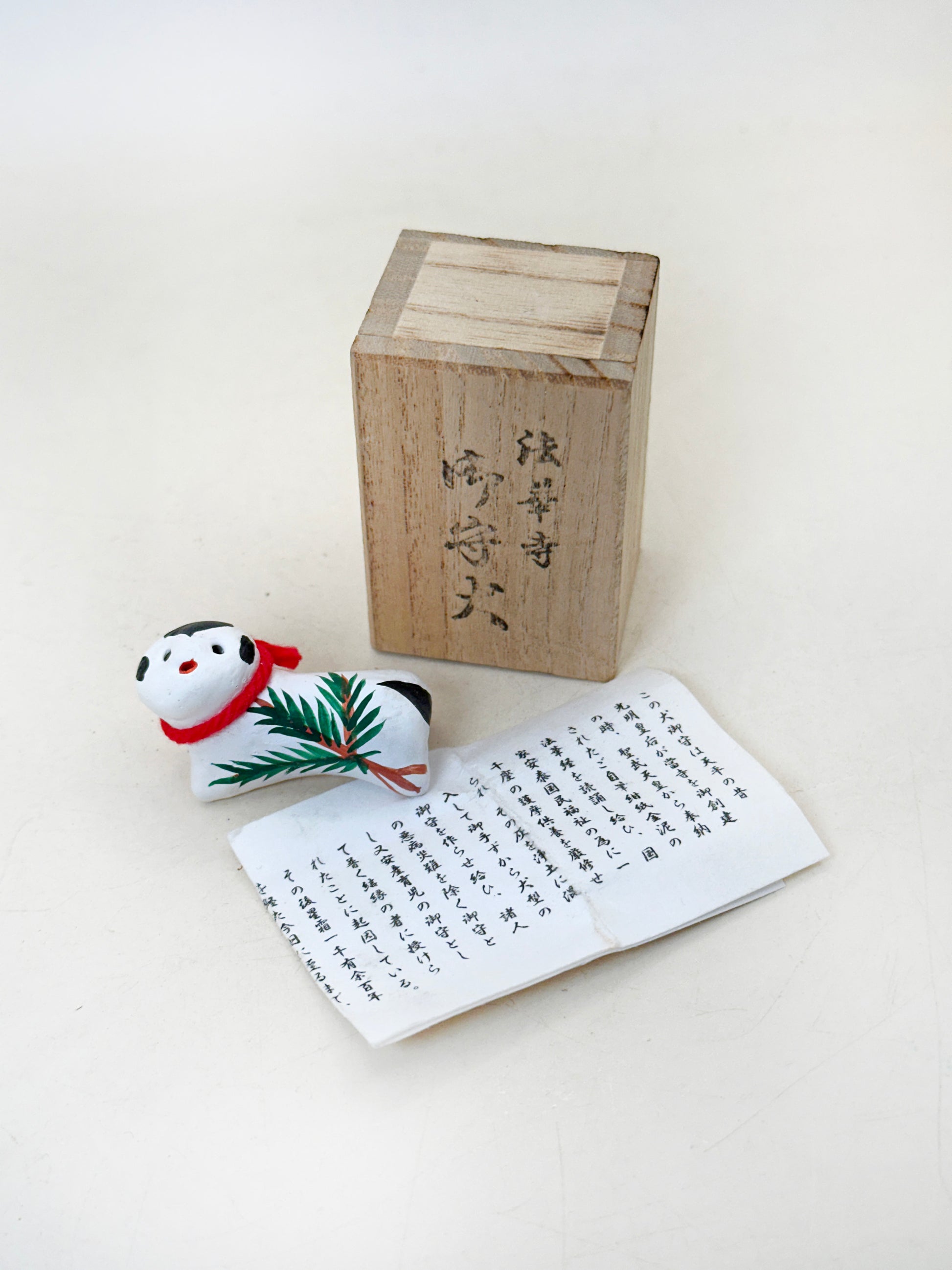 Housed in its original wooden box with accompanying explanatory leaflet, the piece reflects its role not merely as a decorative item but as a spiritual charm (omamori). At Hokke-ji, a temple historically associated with women’s faith and protection, such figures were given or purchased as blessings for health, family safety, and especially protection of children.