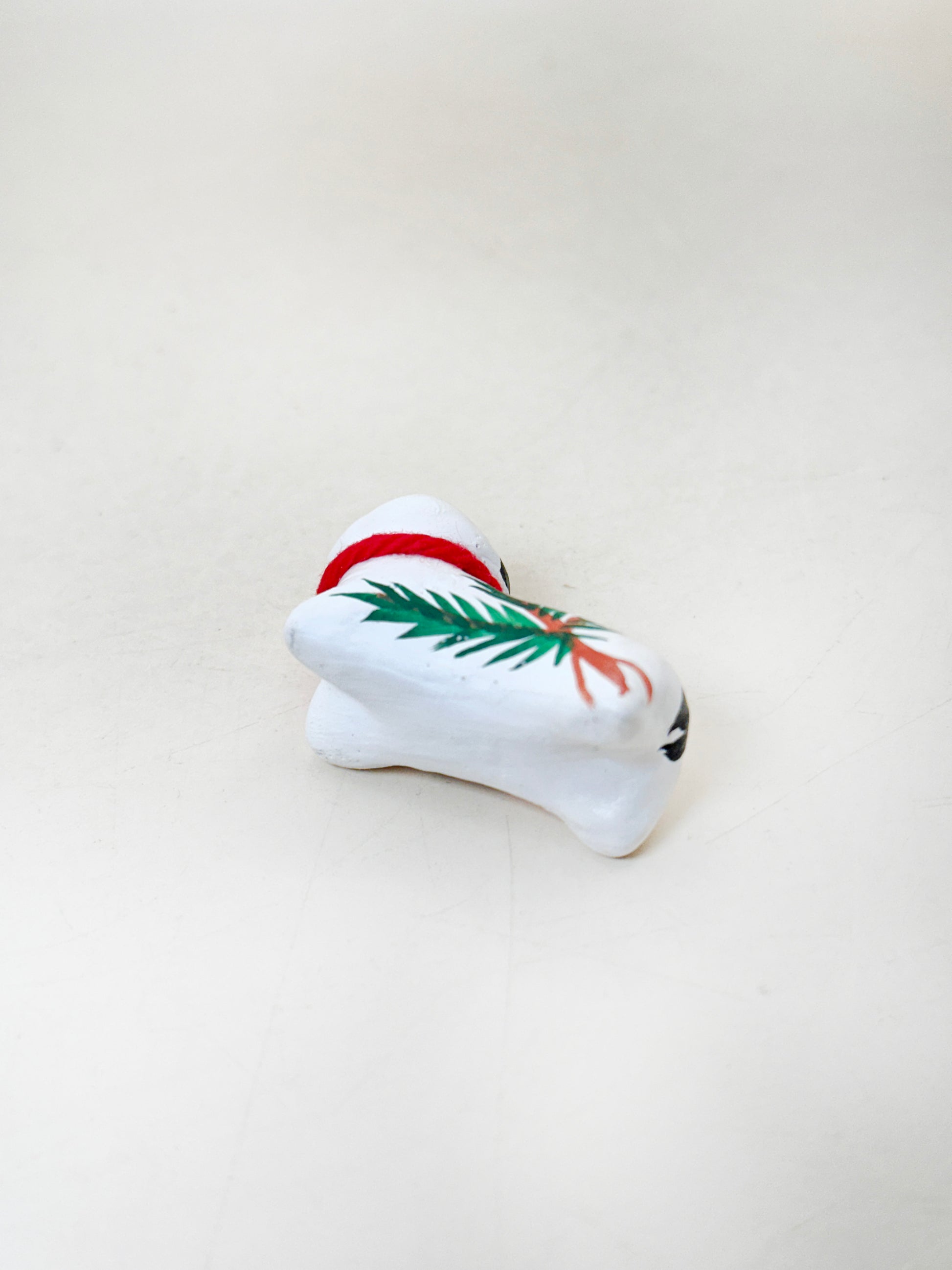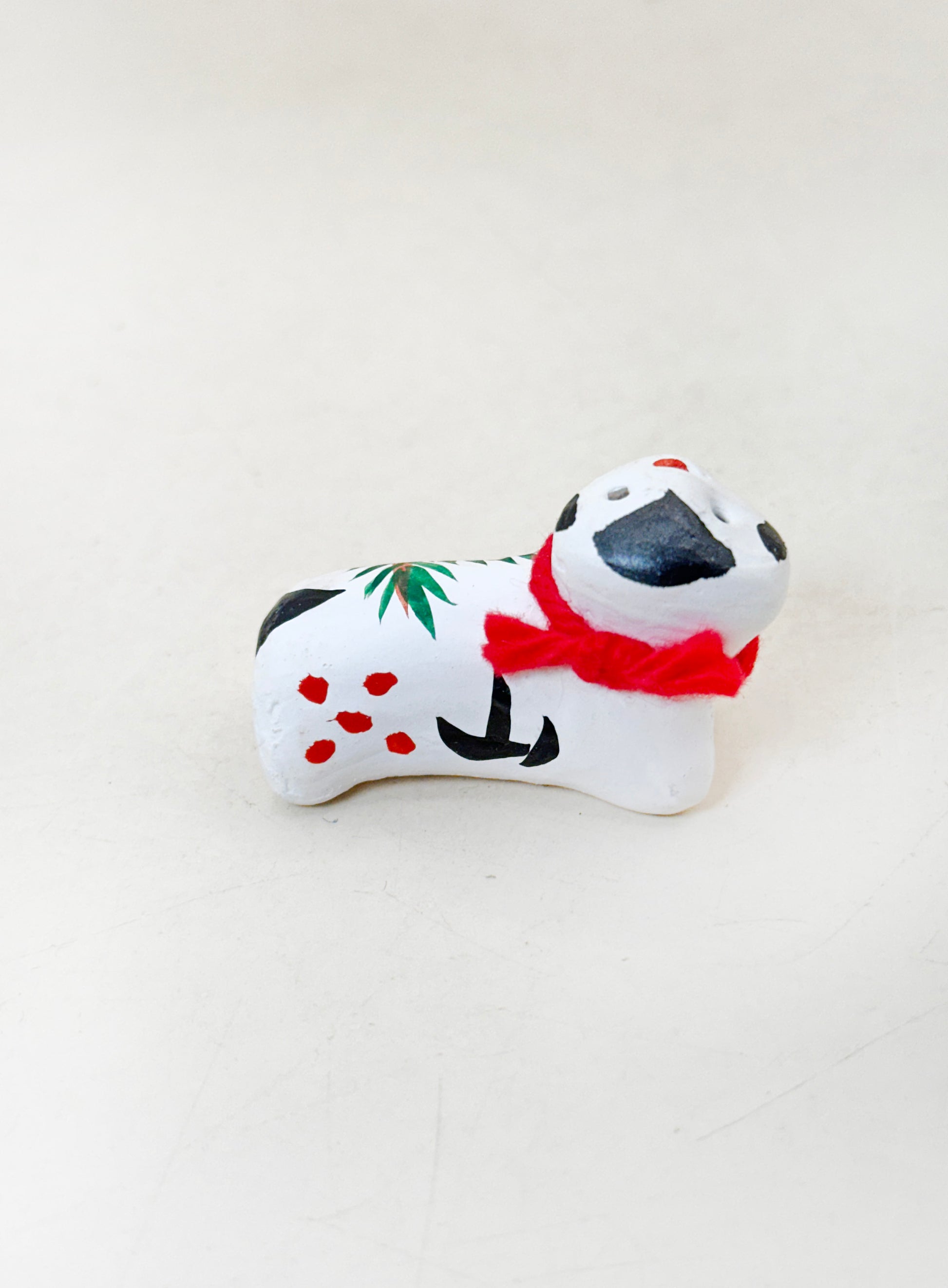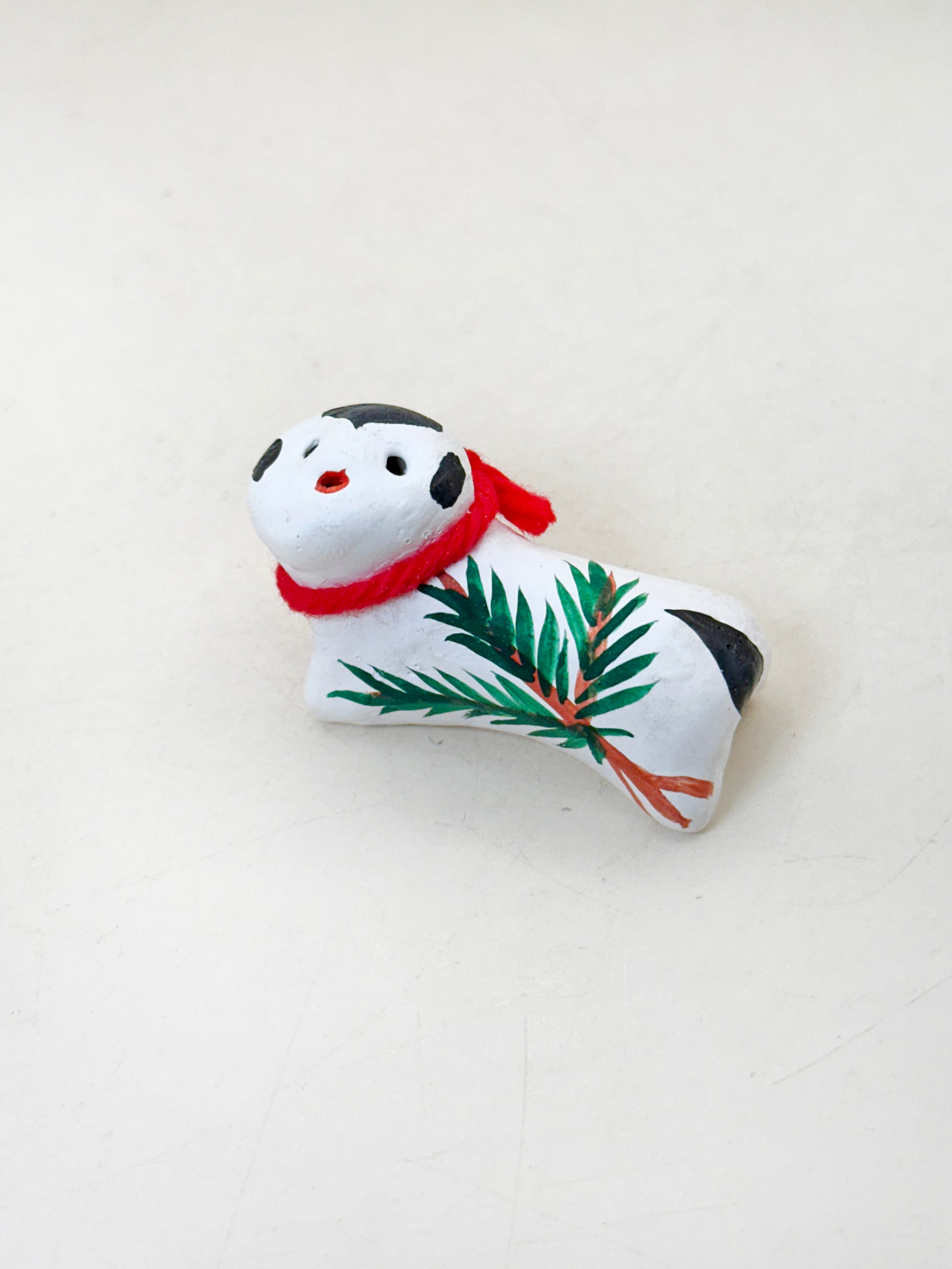 The figure is a stylized white dog, simply modeled with rounded forms and hand-painted features that give it a gentle, watchful expression. Adorned with a red collar and a sprig of green pine painted along its body, the design combines auspicious elements—the dog, a long-standing symbol of protection and safe childbirth, and pine (matsu), representing longevity and resilience.