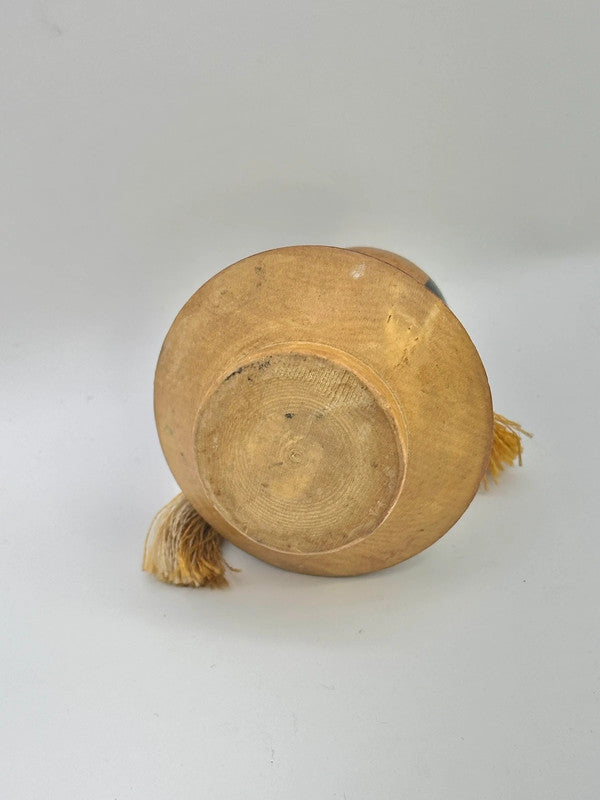 One vintage Japanese kokeshi doll. This is a creative kokeshi. The eyes and her head are very round and large in proportion. Colors are still very vibrant.