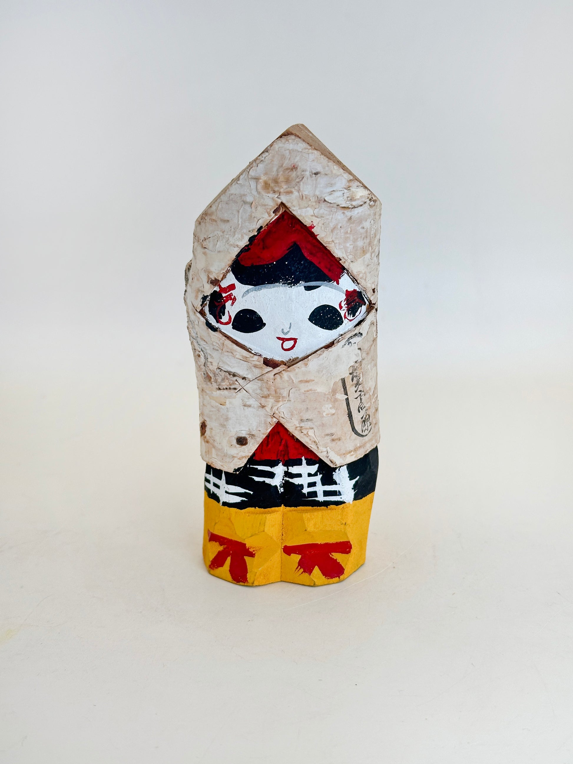 A vintage Yukinko Kokeshi doll, hand-carved from white birch wood in the traditional itto-bori (一刀彫) style, where the form is shaped with a single blade, leaving bold, expressive facets and an organic feel. The face of the doll peeks out from a diamond-shaped opening in the bark, a child warmly bundled against the snow, an homage to the Yukinko motif, symbolizing innocence, protection, and life in snowy regions of Japan.
