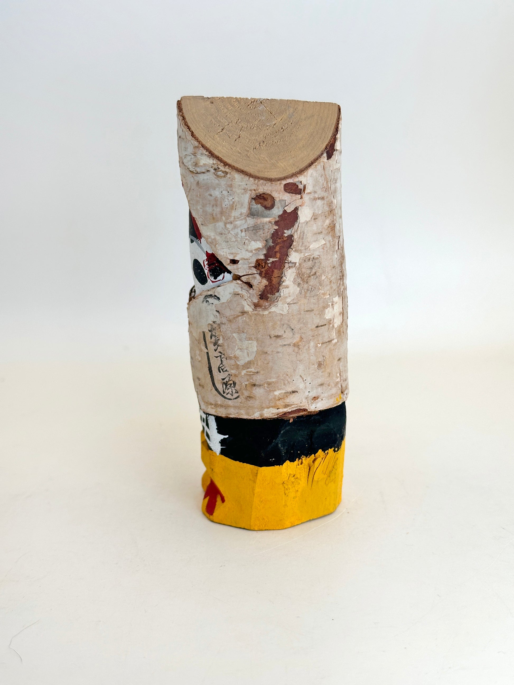 The doll is painted in a vivid palette: a black robe adorned with white patterns and a base of bright yellow and red accents, evoking traditional northern winter wear. The outer bark remains intact around the head and upper body, giving a natural, rustic aesthetic unique to birch wood.