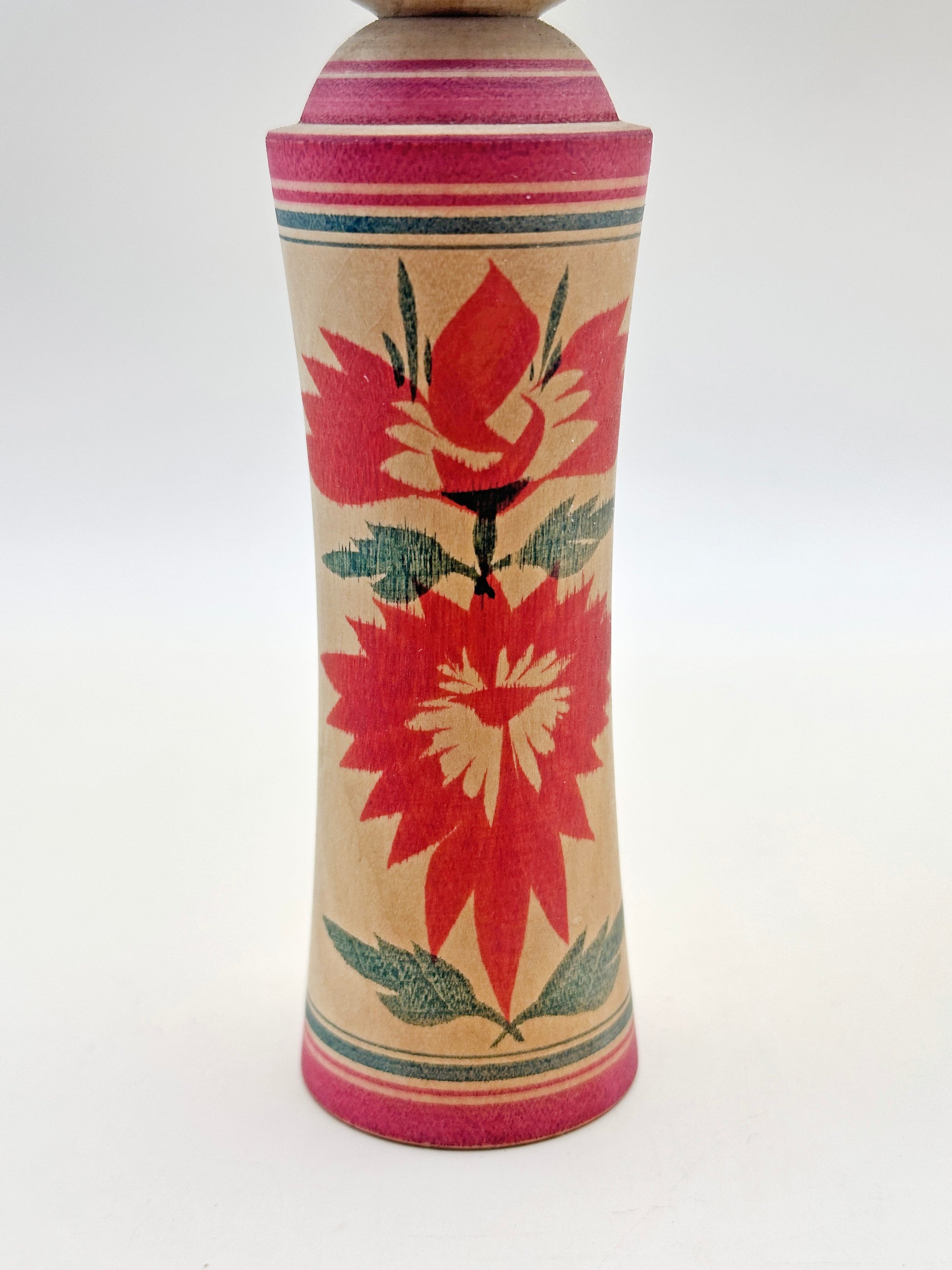 This Naruko kokeshi was crafted by Takashi Endo (遠藤孝志, 1949–), a dedicated artisan who carries forward the distinguished lineage of Naruko doll-making. With its serene smile, soft gaze, and vibrant floral pattern, the doll embodies the warmth and gentle elegance characteristic of the Naruko tradition. The meticulously hand-painted chrysanthemums, rendered in deep red and green tones, enhance the cylindrical form with a sense of seasonal beauty and balance. The simple, rounded head is framed by a dynamic red-and-black painted hairstyle that emphasizes the doll’s expressive, youthful face.