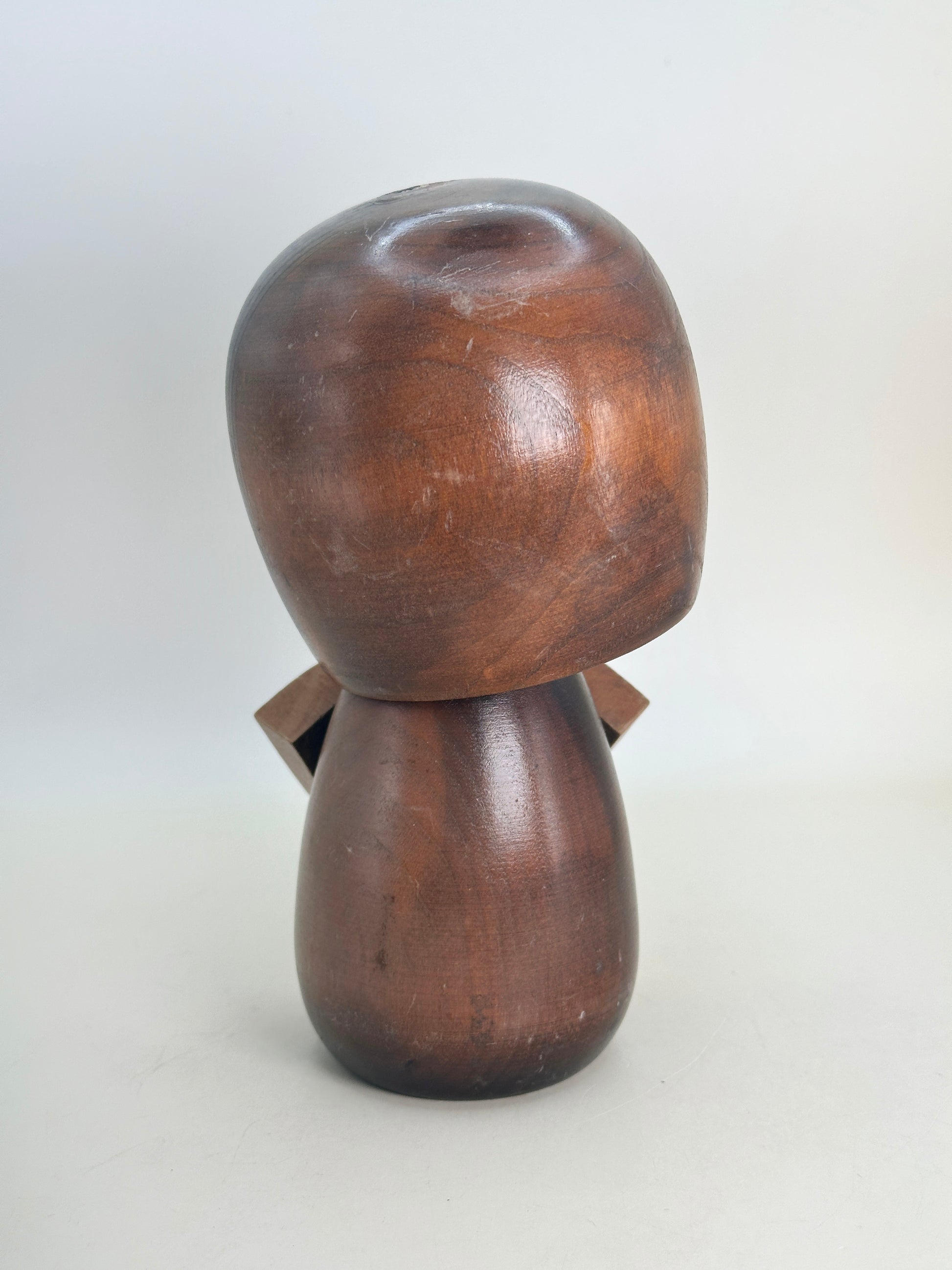 Ishida Tomio was known for reinterpreting traditional kokeshi styles through a modern, almost lyrical lens. His figures often possess a soft charm—cute yet dignified—balancing childlike warmth with refined restraint. In Kosode, this balance is especially evident: the understated facial expression and compact silhouette evoke serenity, while the garment’s form subtly celebrates historical fashion and craftsmanship.