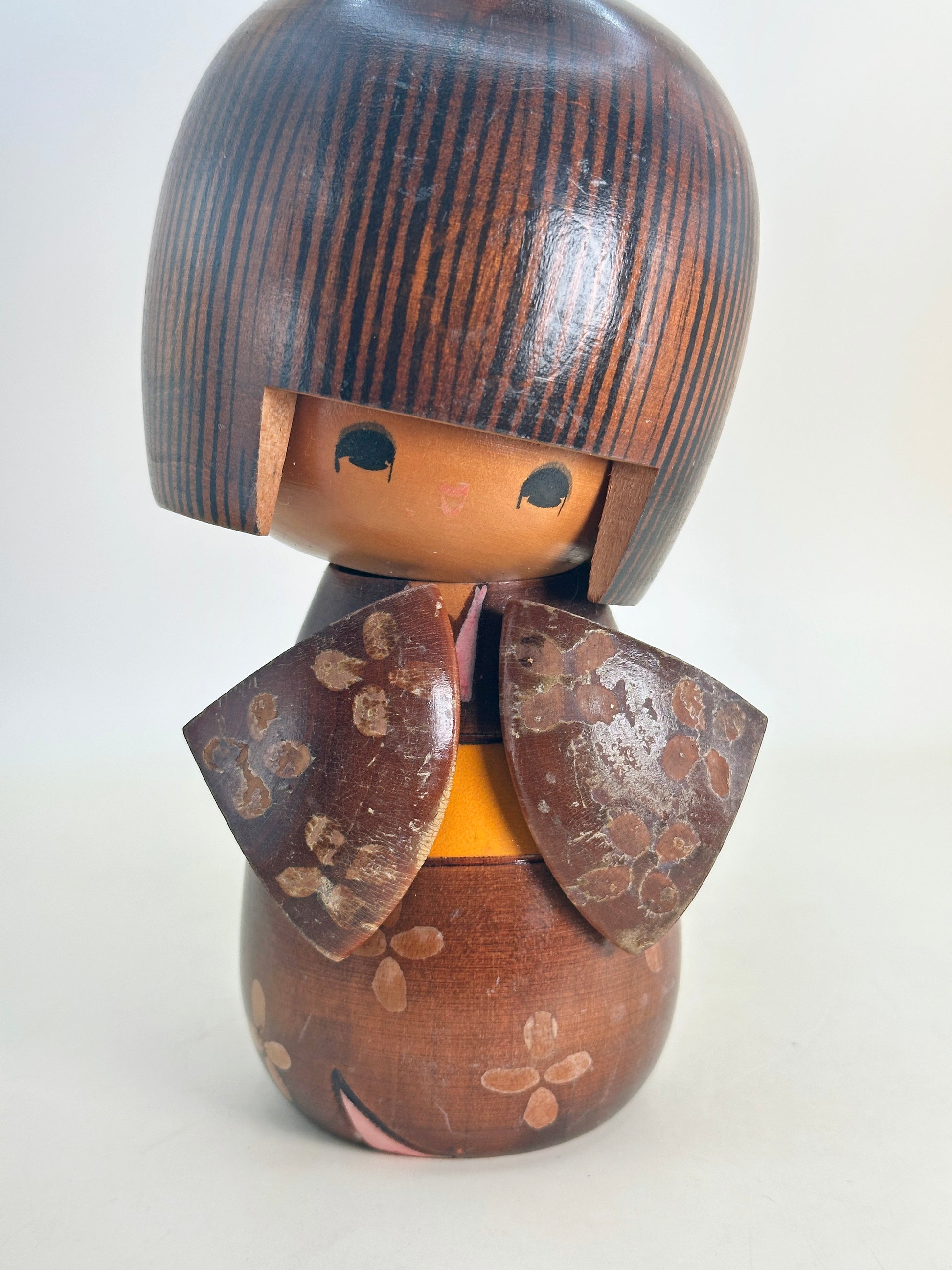 What sets this work apart is its complex, multi-part construction. Rather than being turned from a single block of wood, the hair, kimono, and body are carved and painted separately, then carefully assembled one by one. This meticulous process allows for greater sculptural depth and precision, particularly in the flowing hairline and the layered folds of the garment, giving the figure a quiet elegance and a sense of movement rarely seen in simpler forms.