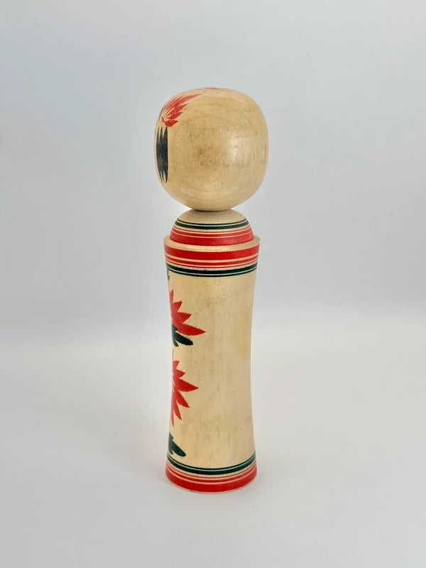 As common with Naruko dolls, the head can slightly turn and produce the characteristic "kiki" squeak sound, a delightful feature of this tradition. About the Artist – Koyama Kesaki (1940–): Born in 1940, Koyama Kesaki is known for his faithful dedication to Naruko kokeshi techniques, combining bright, cheerful colors with expert woodturning skills. His work is particularly appreciated for its balance between tradition and artistic individuality. He remains a respected figure among collectors and admirers of Japanese folk art.