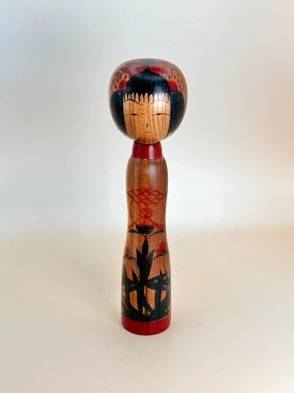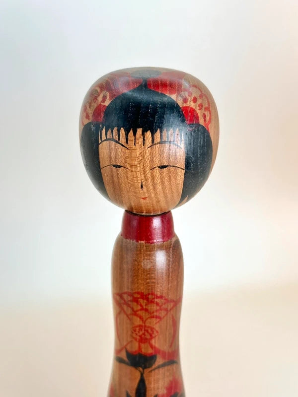 A Naruko-style kokeshi by Tokio Takase features bold floral motifs and expressive, traditional brushwork. The doll’s serene facial expression is delicately rendered, framed by glossy black hair and crowned with vibrant red detailing. The body is adorned with richly colored stylized chrysanthemums and elegant black foliage, extending from a warm natural wood base that reflects the artist’s mastery of the lathe and brush.