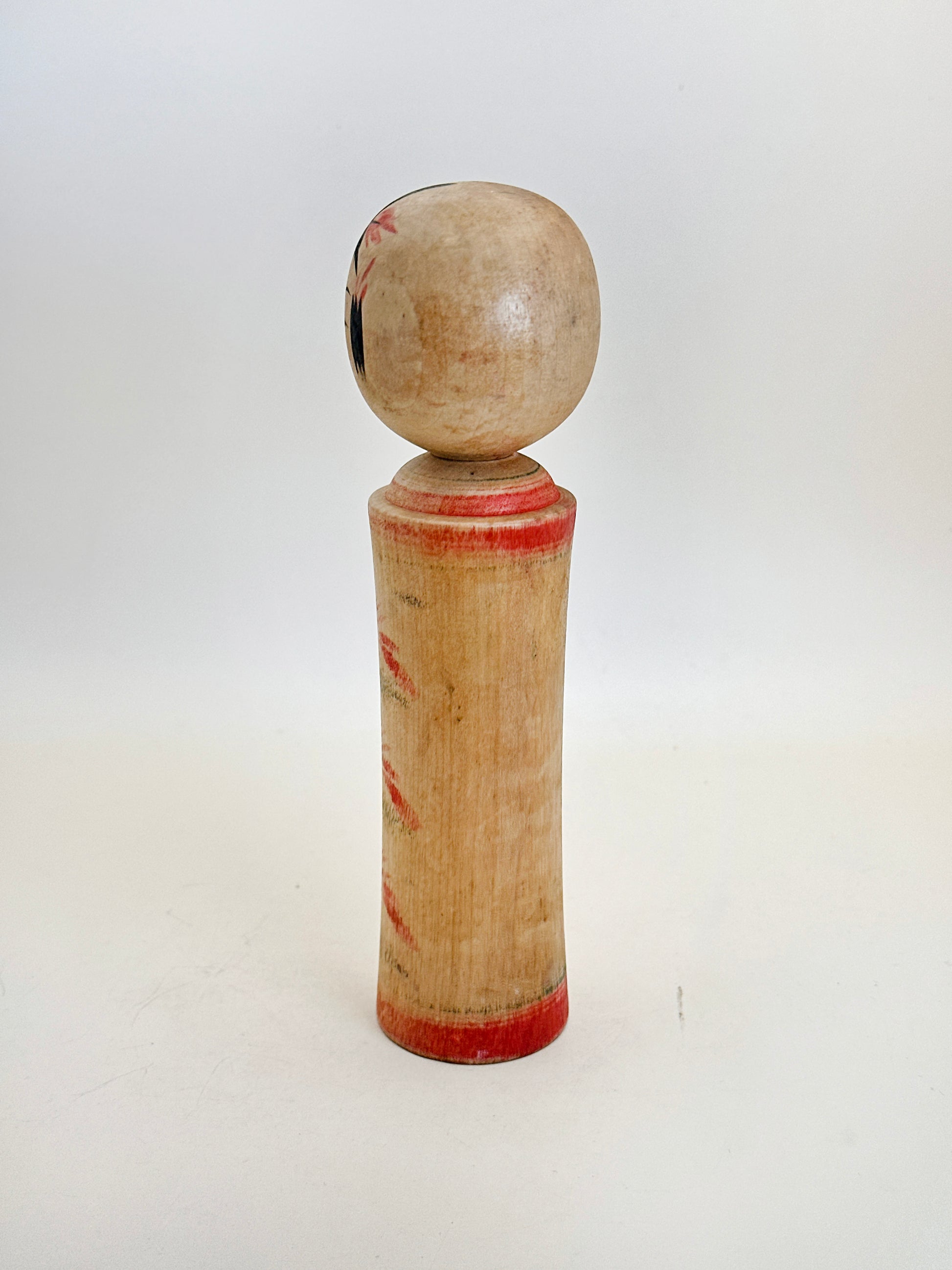 This kokeshi features the hallmark traits of the Naruko tradition: a defined cylindrical body, expressive face, and a crown of red petals adorning the head. The body is decorated with soft red brushwork floral motifs, subtly faded, exuding a sense of rustic charm and quiet elegance. The overall form is both refined and warm, reflecting Hideo’s deep respect for tradition and his family’s heritage.