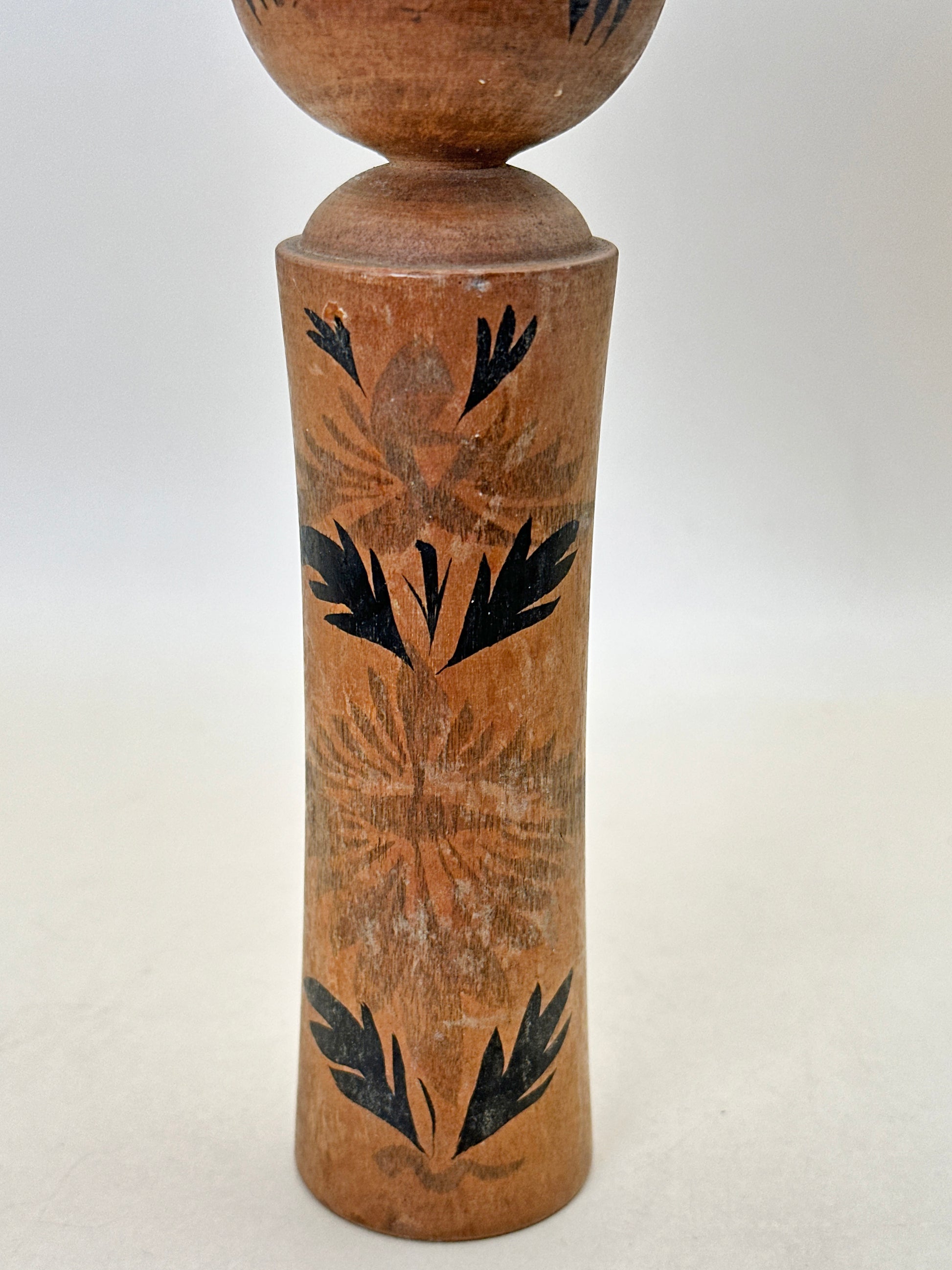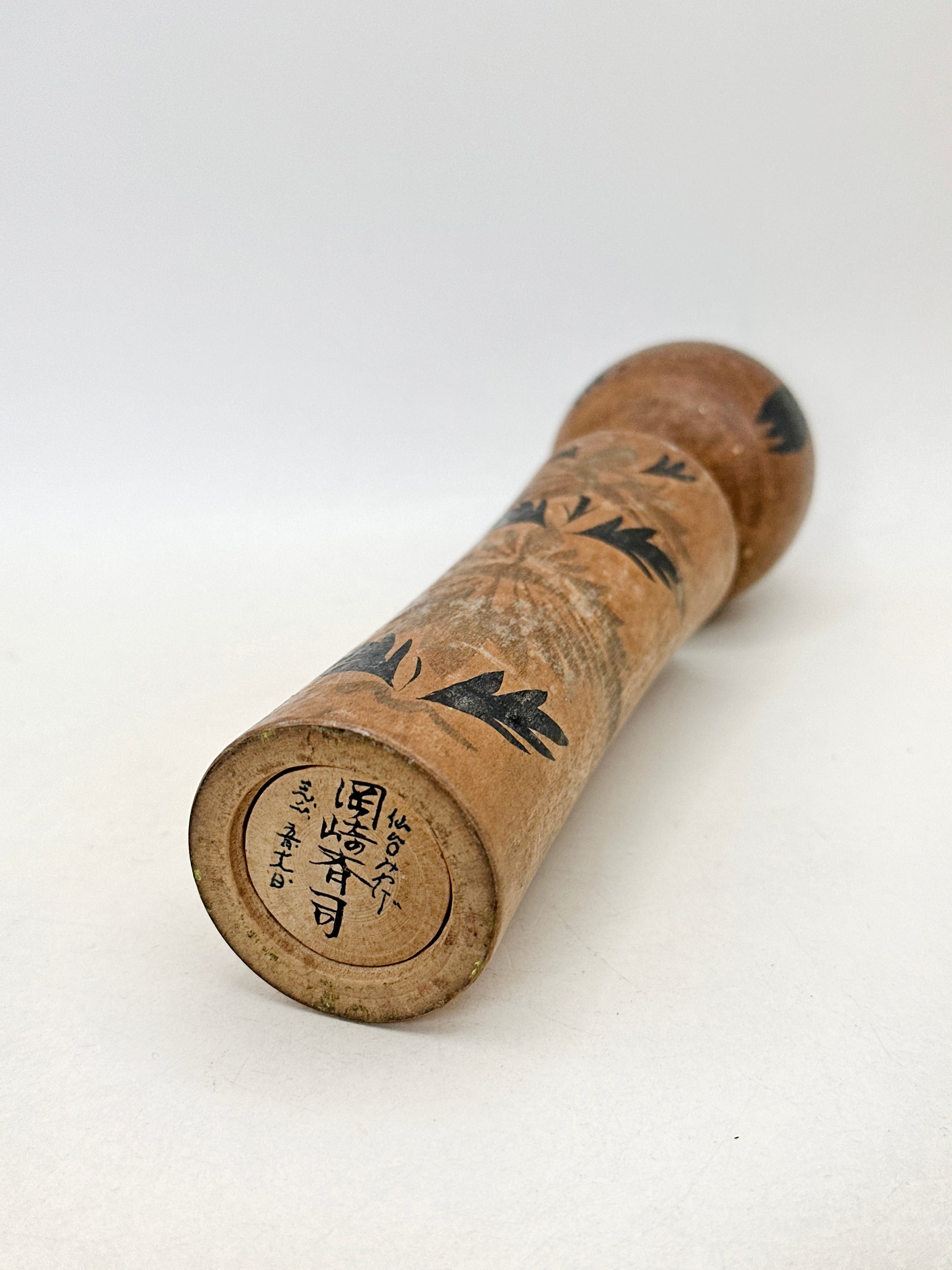 This Naruko kokeshi by Seiji Okazaki 岡崎斉司 (1926–2002) beautifully reflects the strength and refinement of the Okazaki family tradition. The doll features a rounded head with a serene, smiling expression. The softly arched brows and gently closed eyes convey warmth and quiet contentment, while the small curved mouth adds a sense of liveliness.