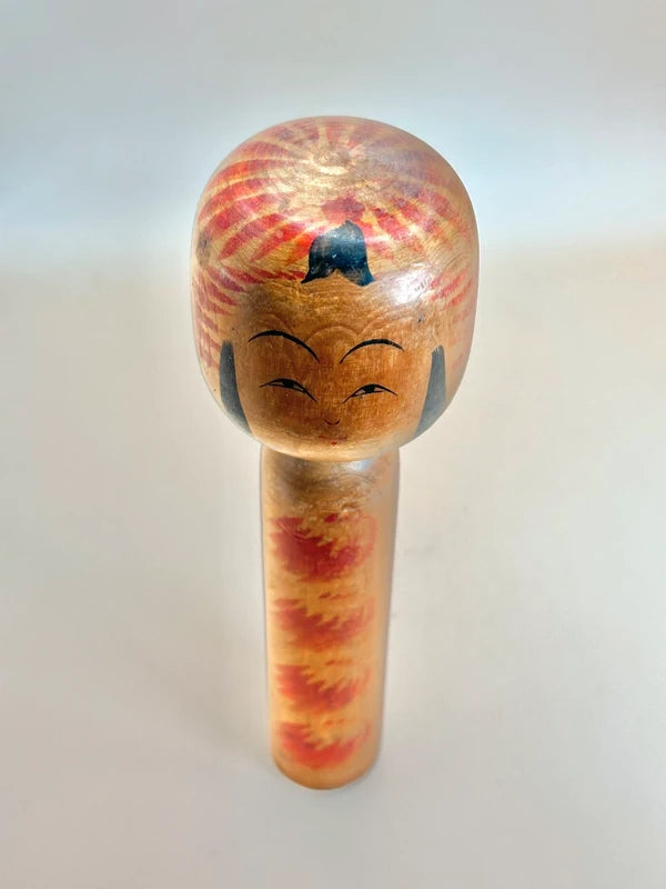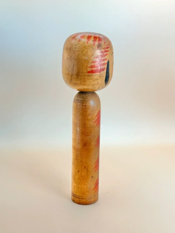 A Togatta-style kokeshi by master craftsman Sato Sanzo is a rare and precious example of early 20th-century Japanese folk artistry. The doll features a traditional narrow cylindrical body with clean lines and a gentle tapering toward the base. The head is large and softly rounded, painted with a sweet, smiling expression and delicately arched eyebrows. Bold crimson chrysanthemum patterns run vertically down the torso, rendered in a rhythmic composition that captures the elegance of hand-painted brushwork.