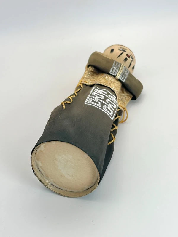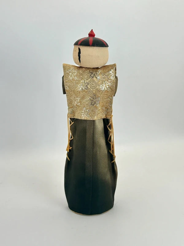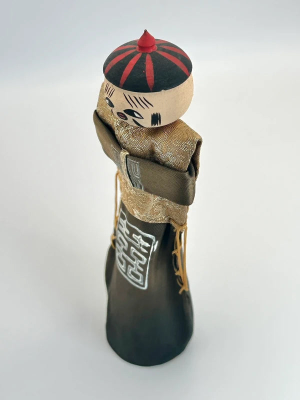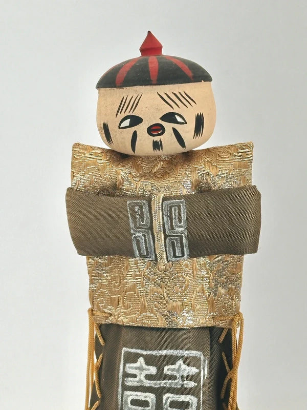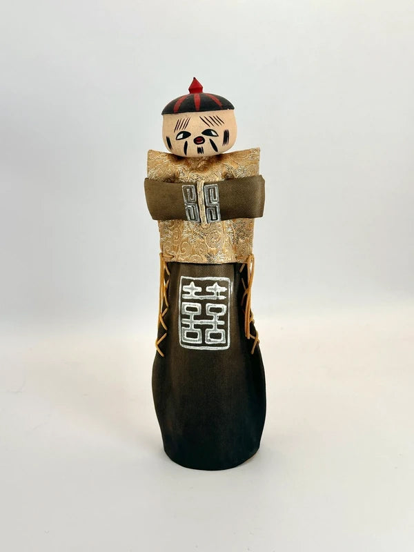 The gold and dark robe blend Chinese theatrical costume elements with Japanese textile craftsmanship. The character embroidered on the robe symbolize happiness and double prosperity. In Peking Opera, 丑角 (chǒu) roles are crucial for injecting humor and humanizing the drama. Their painted faces and expressive performances convey irony, intelligence, and street-smart cleverness. Japanese artisans often created such dolls during the mid-20th century for cultural export and tourism.