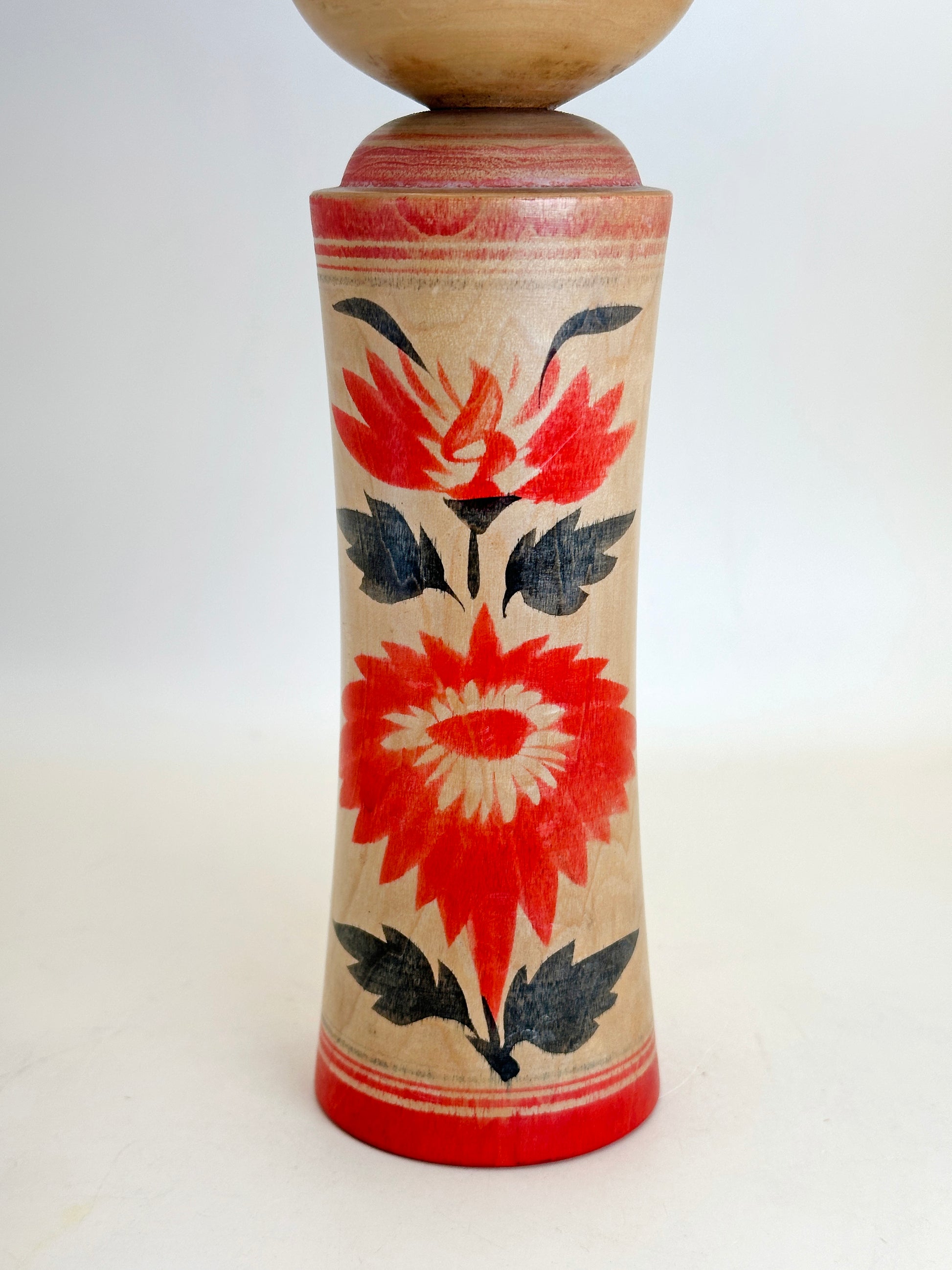 This is a Naruko-style kokeshi doll by Setsuko Hayasaka (早坂せつ子, 1935–), a rare female artisan in the traditional kokeshi world. Measuring  21cm in height, the doll is characterized by its vibrant floral motifs in rich red and black tones, with large chrysanthemum-like blooms adorning the body. Her delicate facial expression, framed by bold black hair and crowned with red petal accents, radiates charm and quiet elegance.