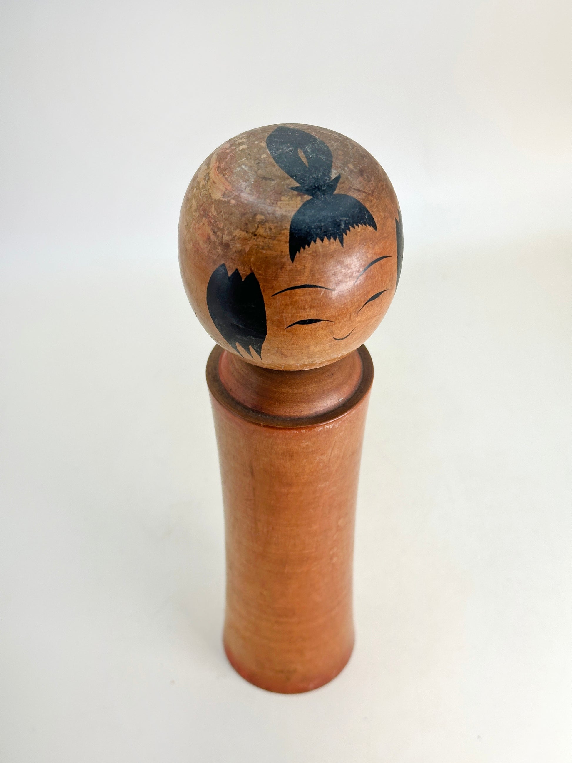 This particular kokeshi features the hallmark Naruko characteristics: a rounded head with a high topknot, detailed fringe and sidelocks, and a soft, smiling expression. The cylindrical body gently flares toward the base and is adorned with a lightly brushed red pattern that has aged beautifully over time, giving the doll a soft, almost faded patina that adds to its nostalgic charm.