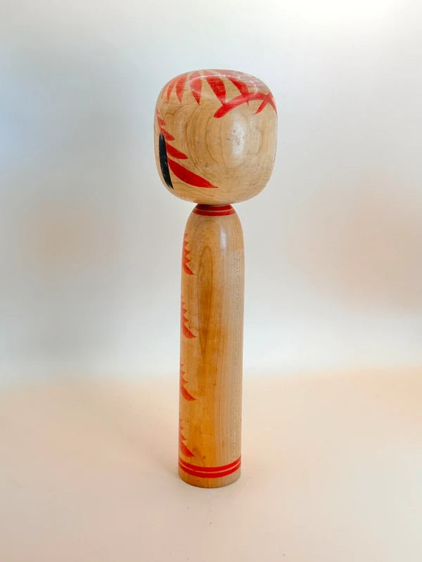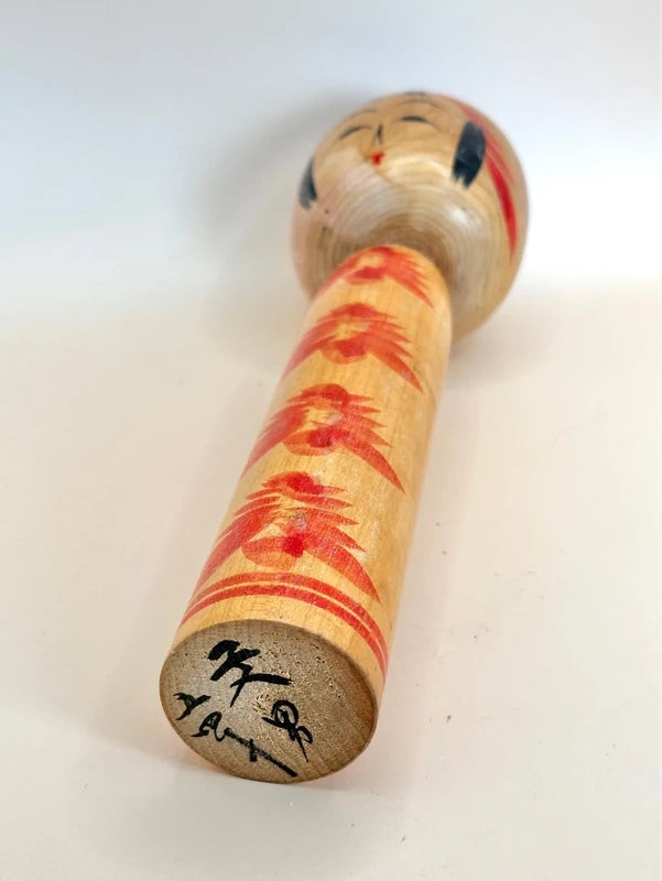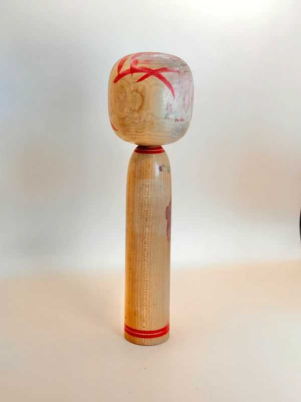 Fumio Ogawa (b. 1950) was born in Watari, Miyagi Prefecture. Initially employed by Tokyo Heavy Industries, his life took a turn after meeting kokeshi craftsman Yuichi Komuro, who inspired his interest in traditional dolls. Ogawa began training in woodcarving around 1973 and became independent in 1978. He later honed his skills under Masahiro Sato (Yajiro lineage) and Tetsuro Sato (Togatta lineage). Ogawa's dedication to the craft also extended to caring for his master Masahiro Sato in his later years. Though he balanced doll-making with other jobs, his kokeshi are appreciated for their faithful adherence to traditional forms and expressive painting. This piece shows noticeabl fading, especially on the head and side of the body. Offered at a special discounted price due to condition.