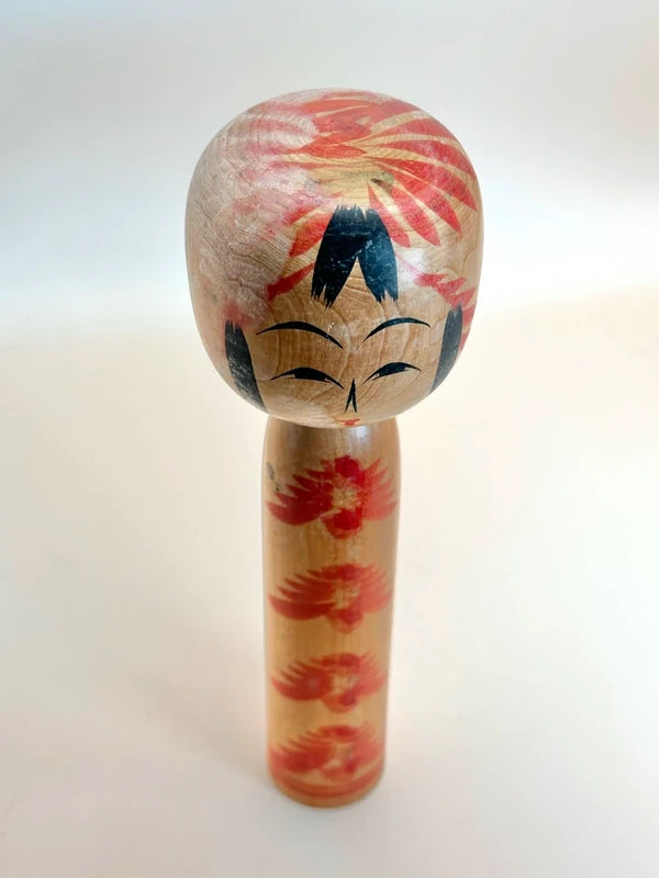A Togatta-style kokeshi is the work of Fumio Ogawa, a contemporary artisan known for bridging tradition and modern craftsmanship. The doll features a classic Togatta form with a slender cylindrical body and a slightly oversized rounded head. The face is delicately hand-painted with expressive eyes and a warm, smiling expression. Red chrysanthemum-like motifs cascade vertically down the body, a traditional floral motif often found in Togatta design. The head is decorated with vivid radial patterns accenting the hairline.