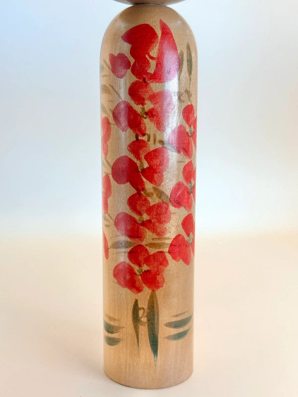 A Yamagata-style kokeshi by Eiichiro Takasaki is a refined example of regional craftsmanship, showcasing a cascading floral design in vivid red across the body—an elegant contrast to the soft natural wood finish. The doll’s expression is delicate and composed, with subtly drawn features and short bangs framed by traditional black side locks, typical of the Yamagata-kei style.