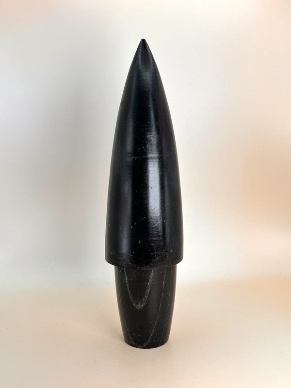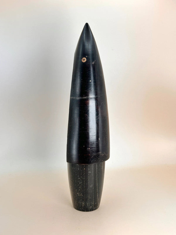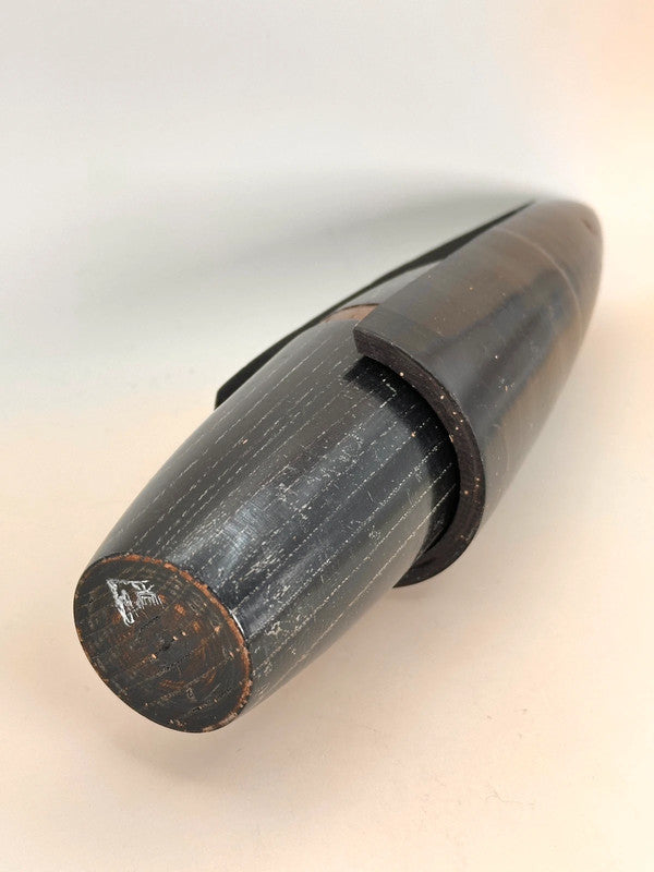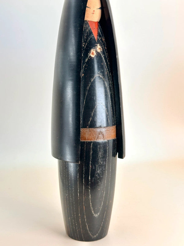 This striking sōsaku kokeshi by legendary artist Shozan Shido (志形尚山) is a perfect example of his minimalist yet deeply expressive style. Carved in an elongated, almost architectural form, the figure stands tall with a cloak-like silhouette in a rich black tone, accented with delicate facial features and a subtle sash around the waist. Its smooth, sleek design captures both serenity and strength, reflecting Shido’s mastery in using simplicity to evoke deep emotion and poise.