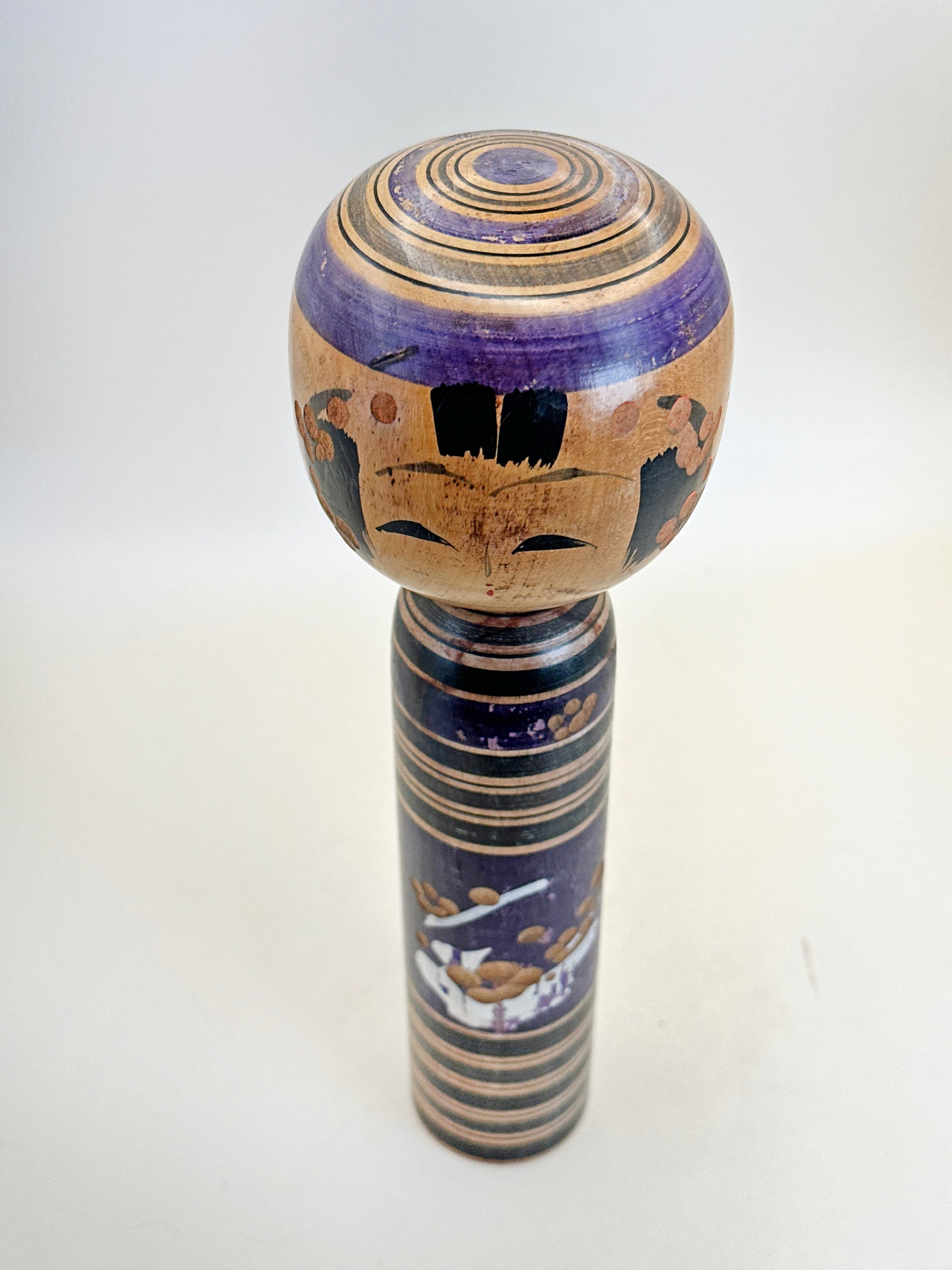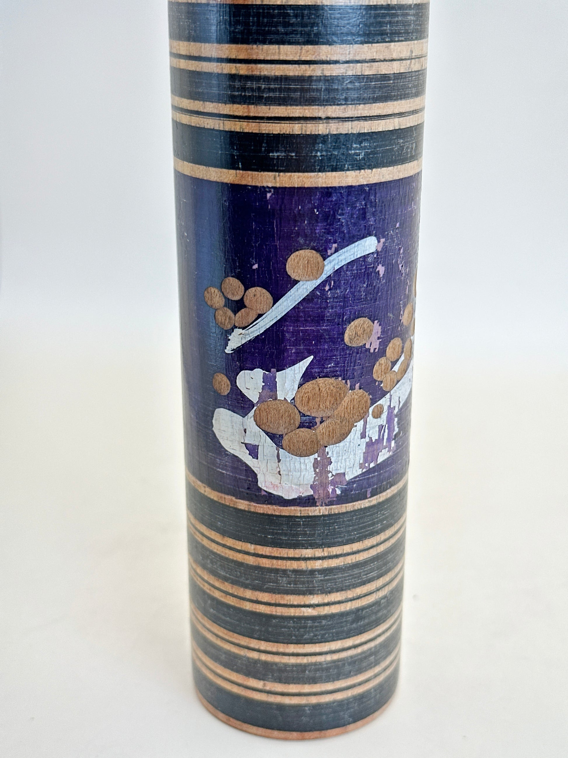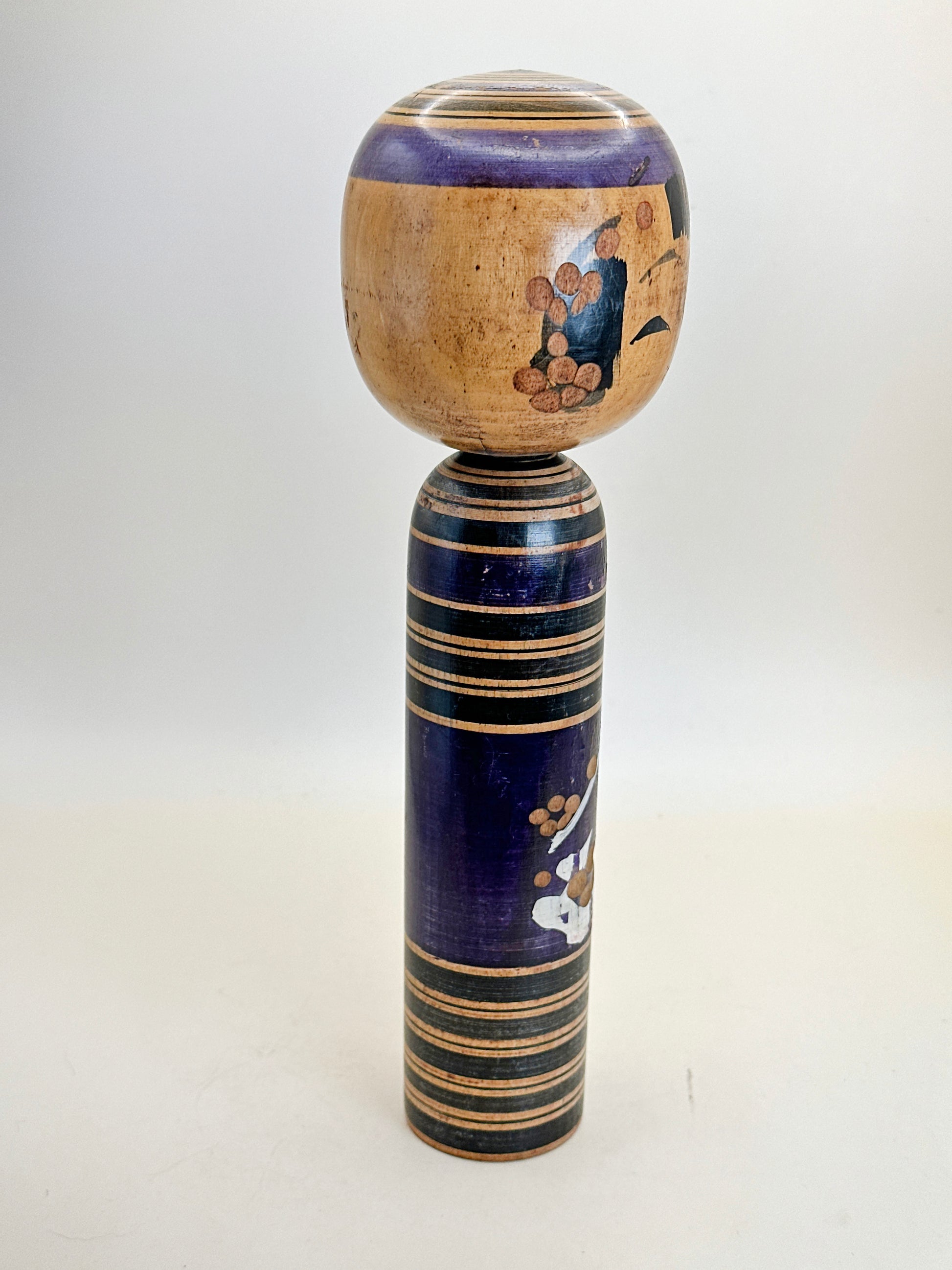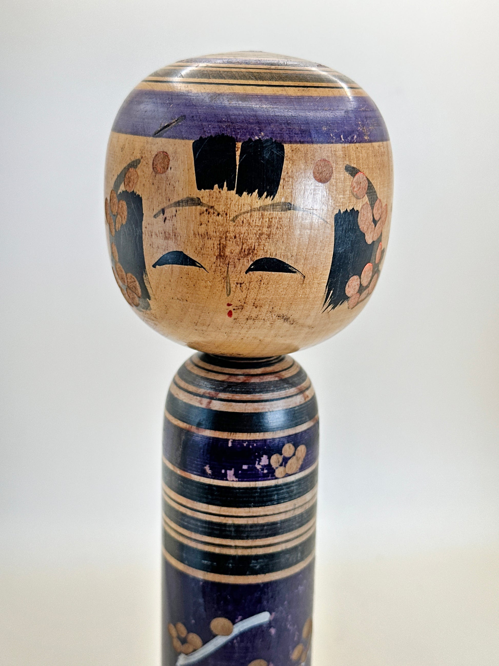 This Sosaku-Shingata kokeshi by Sasaki Katsumi showcases the artist’s signature harmony of bold color, refined balance, and expressive minimalism. The doll features Katsumi’s characteristic rounded head, painted with a serene, softly smiling face framed by stylized black side-locks and delicate plum-blossom motifs, the classic imagery that often appears in his work and symbolizes resilience and early spring.
