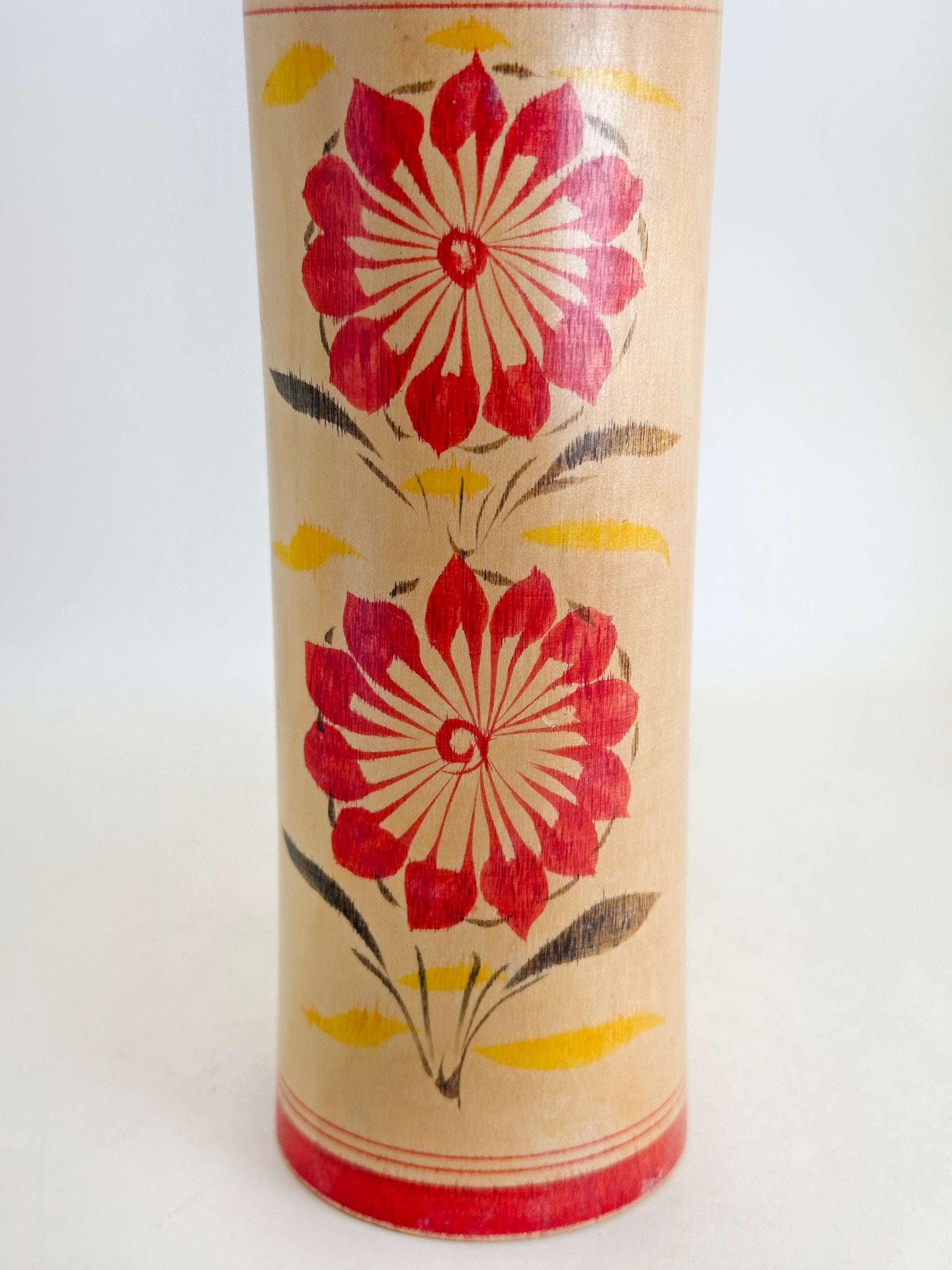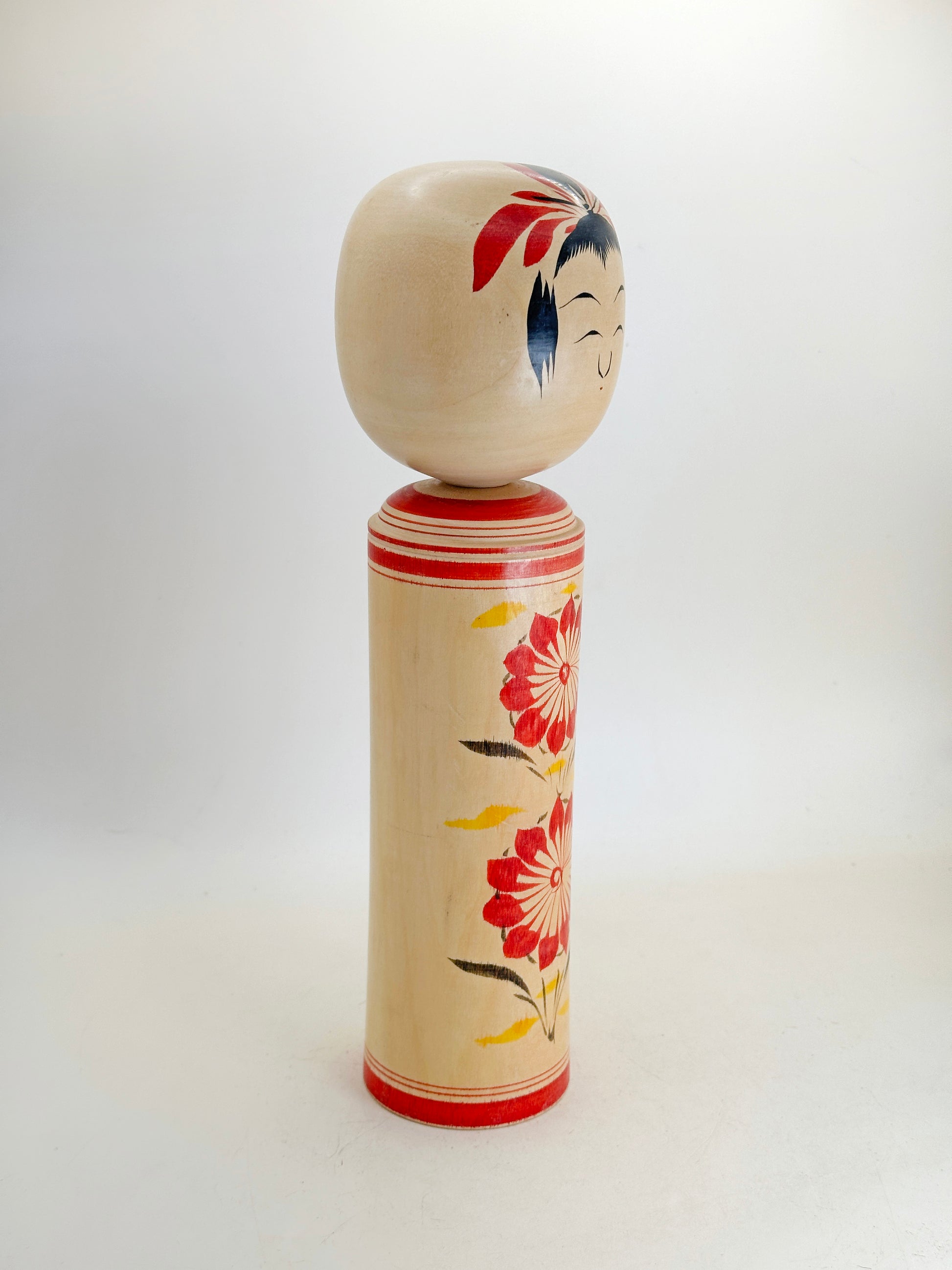 This piece showcases the classic traits of Naruko kokeshi: a rounded head with straight bangs and side hair painted in bold strokes, and a body adorned with finely brushed chrysanthemum motifs in vivid reds, yellow and greens. The rich floral design and gently flared body give this doll a dignified yet warm presence.