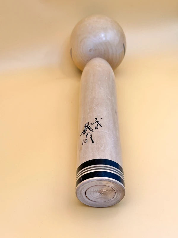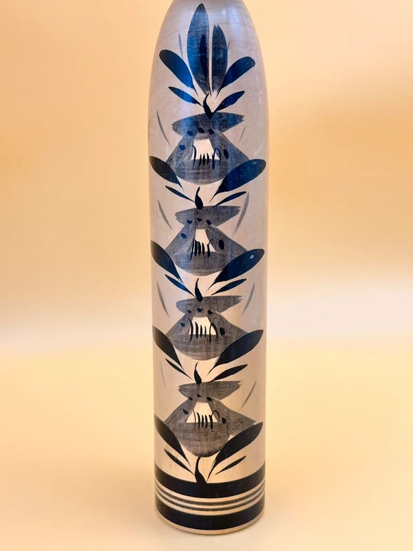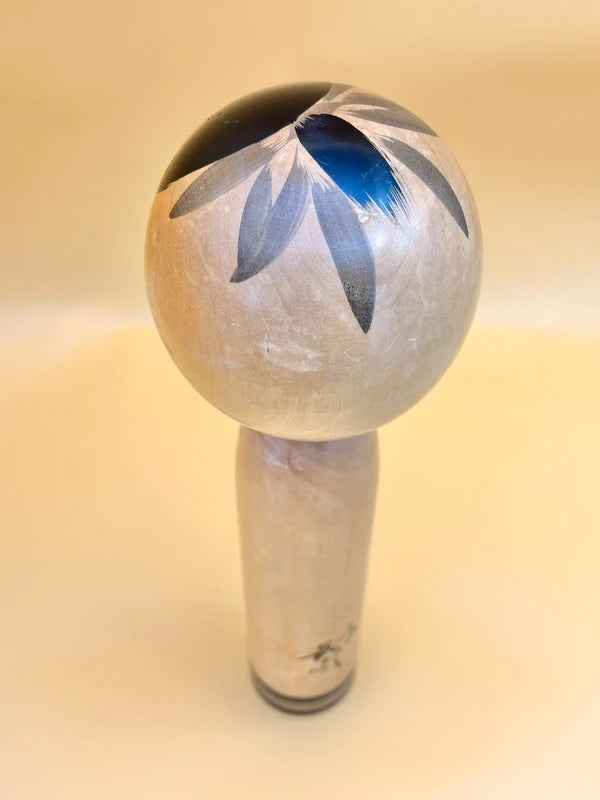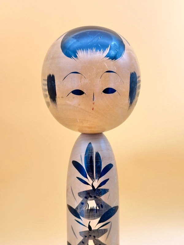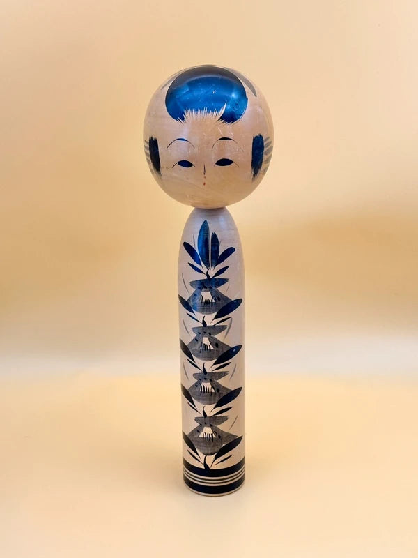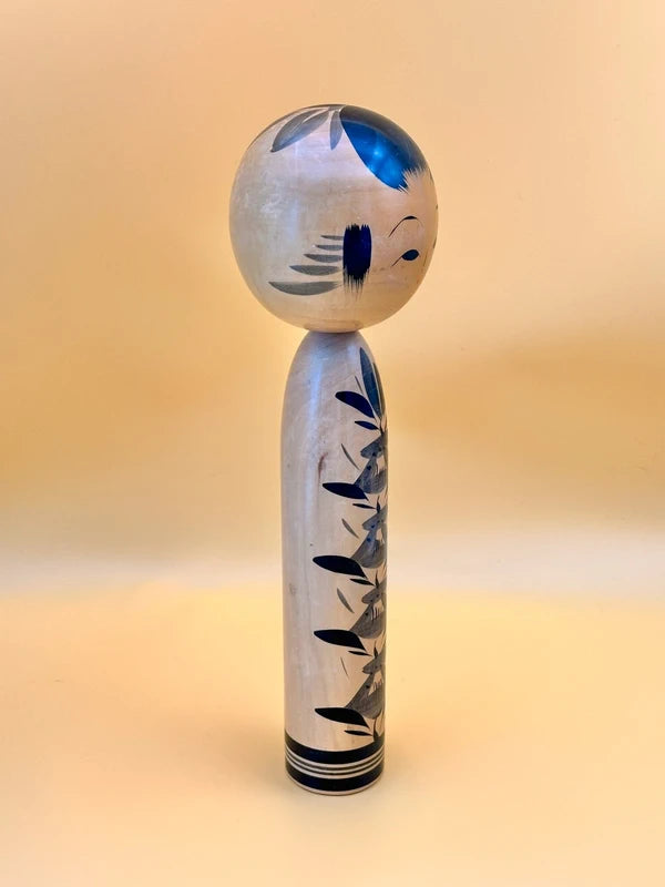 This striking 37cm tall kokeshi by Nidaime Tetsuen is a graceful example of feminine craftsmanship within a traditionally male-dominated world. The doll's long, slender silhouette is adorned with bold, stylized floral motifs painted in dark indigo tones, ascending vertically in symmetrical rhythm. Her serene facial expression, with softly arched brows and delicate eyes, conveys a quiet dignity, while the smooth, polished wood enhances the clarity and contrast of the painted design. Nidaime Tetsuen’s unique hand is visible in the balance of form and detail, refined brushwork, careful composition, and a deep respect for tradition harmoniously come together in this elegant work.