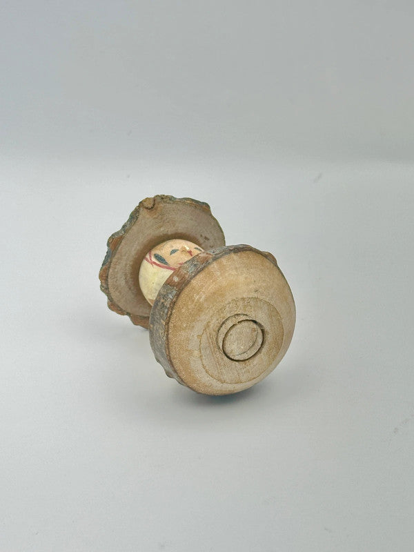 Vintage omiyage kokeshi doll with bobbled head. The kokeshi kept the raw wood texture on the the hat and the body. The body is a bottle of a sake. It’s a symbol of prosperity, respects and wishes for having enough of what we need.
