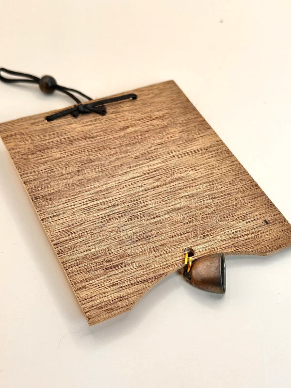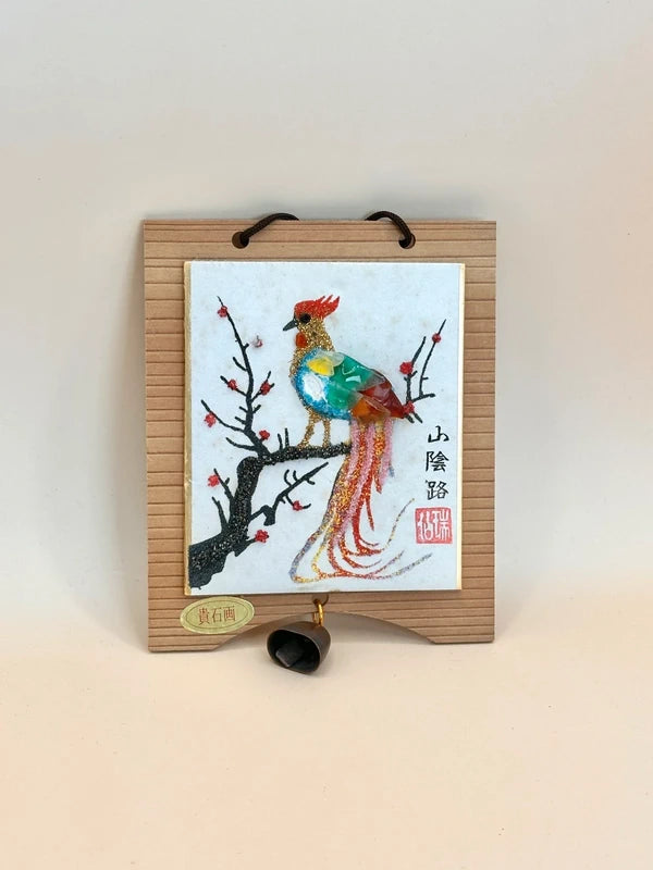 Rendered in dazzling mineral pigments, the bird’s plumage glows with a rainbow spectrum, emerald green, sapphire blue, fiery red, and gold, enhanced with tactile, gem textures. The card is mounted on a natural wooden frame with a string for hanging and a small bronze bell, adding a charming audible element to the visual beauty. 山陰路 (San'in-ji) – meaning “San'in Road,” a historic region and route in western Japan.