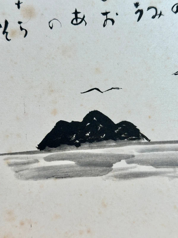 The card combines musical notation and handwritten lyrics in brush and ink, expressing a nostalgic and poetic atmosphere. Below the staff lines is a delicate sumi-e ink painting depicting a quiet seascape: an island on the horizon with gently gliding birds, enhancing the lyrical calm and emotional depth of the piece.