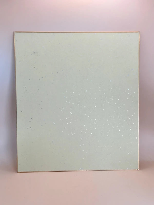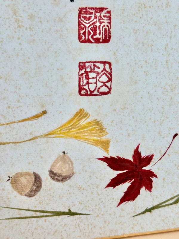 This vintage shikishi art card beautifully captures the tranquil essence of Japanese autumn through the poetic phrase 紅葉滿山川 (kōyō yama kawa ni michiru), meaning “Autumn leaves fill the mountains and rivers.” The refined calligraphy flows vertically, paired with delicately hand-painted motifs of red maple leaves, ginkgo fans, and ginkgo nuts, symbolizing the seasonal change and the fleeting beauty of fall.