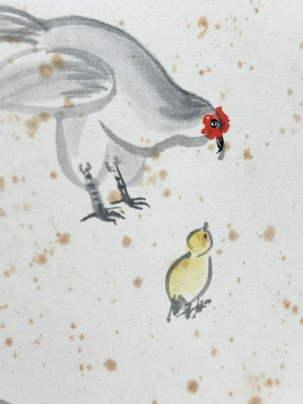 This vintage 1981 shikishi artwork features a tender scene of a rooster, hen, and a small yellow chick, captured in delicate brushstrokes on a traditionally speckled shikishi card. Rendered in minimalist sumi-e ink style with subtle colors, the composition evokes warmth, familial care, and seasonal symbolism often associated with traditional Japanese art.