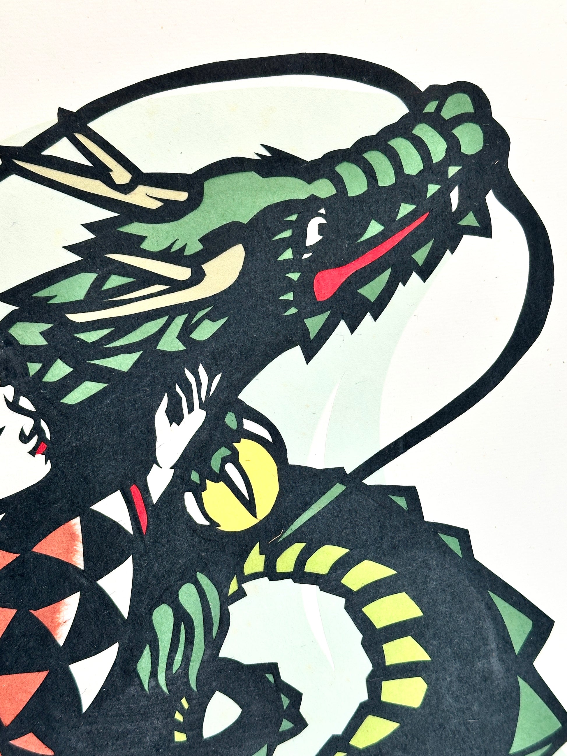 Created using the kirie technique, in which intricate designs are hand-cut from colored paper, this piece showcases exceptional craftsmanship and precision. The contrast of the maiden’s patterned robe and the dragon’s sinuous form evokes a sense of harmony between human spirit and divine power.