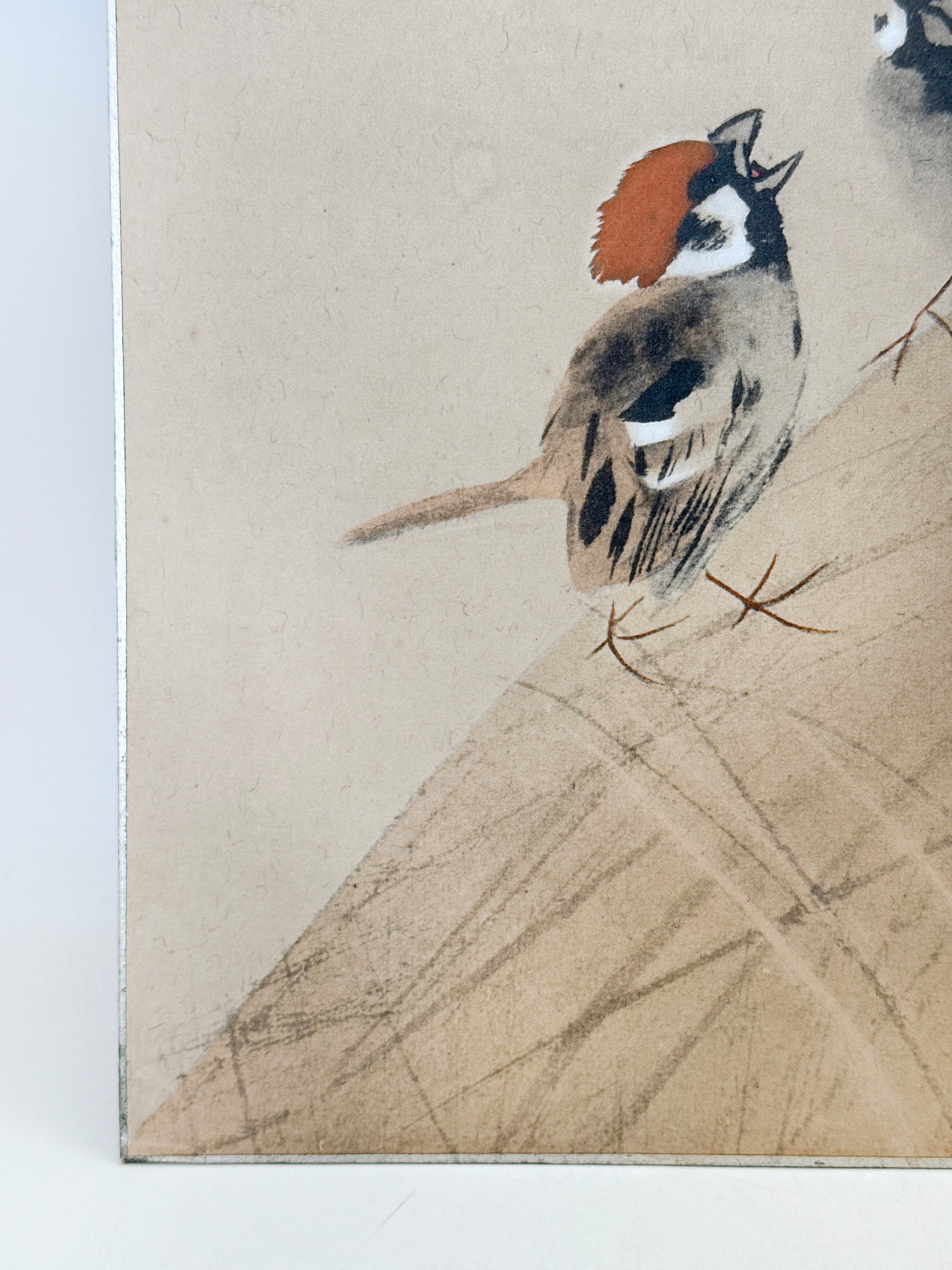 This refined shikishi print titled 『喜雀図』 (Kijaku-zu, “Auspicious Sparrows”) after Takeuchi Seihō 竹内栖鳳 (1864–1942) captures the quiet charm and subtle vitality that characterize the master’s celebrated bird paintings.