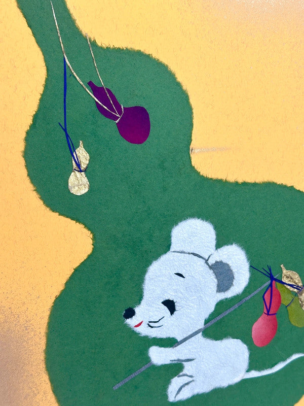 The green background is in the shape of a hyōtan (瓢箪) or gourd—a traditional Japanese symbol of protection, fertility, and good luck. This shape adds both charm and symbolic meaning to the composition. The warm gold-tone backdrop with shimmering accents enhances the celebratory feel, making the piece perfect for auspicious display, especially during New Year or zodiac-themed celebrations.