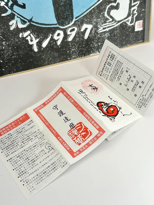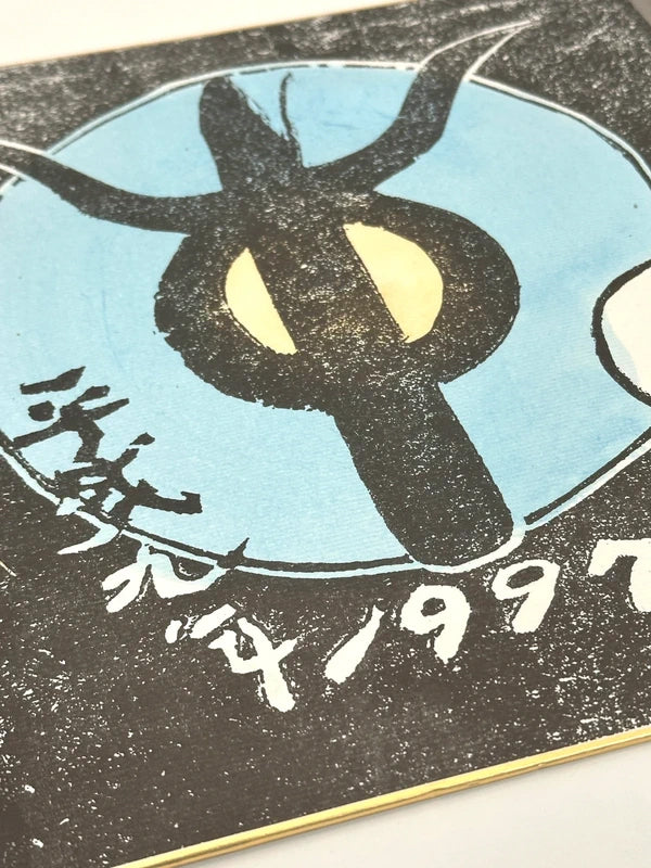 Vintage woodblock print from 1997 by 森天赤 Mori Tenka (1918-2005). A Bodhidharma with the white leaflet of artist information. Woodblock print is a type of art made by carving an image into a block of wood, applying ink to the block, and then pressing it onto paper to create a print.