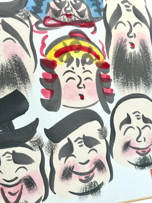 Playful and expressive, the artist uses traditional sumi-e brush techniques combined with a cartoon-like touch to depict the deities with personality and warmth. Their rosy cheeks and beaming smiles reflect the festive spirit they embody.