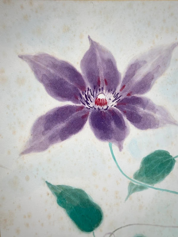Vintage Japanese Shikishi card featuring a hand-painted floral design. The artwork depicts a large, elegant purple clematis flower with vivid, soft-textured petals radiating from a detailed center.