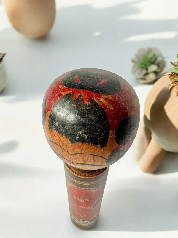 This kokeshi is an example of a Shingata (transitional) doll, embodying the characteristics of a traditional family Tougatta, visible in the head and face (narrow eyes