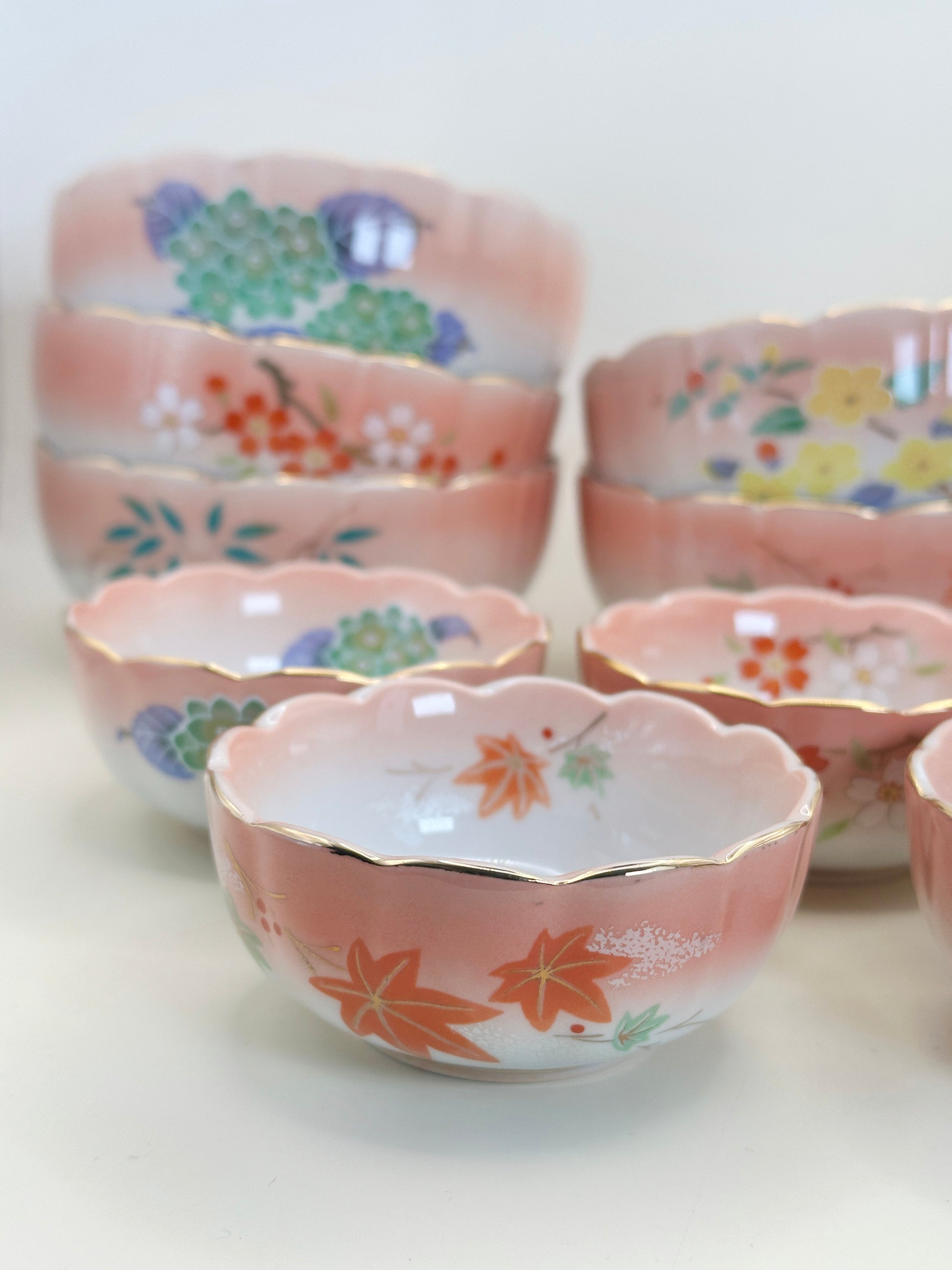 Each bowl is formed in a softly scalloped shape, its gentle curves enhanced by a warm pink-to-white gradient glaze that evokes the delicate tones of early spring blossoms. The rims are subtly accented with fine gold edging, lending a quiet sense of elegance without overwhelming the design. Across the surfaces, a variety of hand-painted floral motifs appear in rich yet harmonious colors—maple leaves, cherry blossoms, hydrangea, plum, and wisteria—each rendered in a different composition. This e-gawari (絵変り) approach ensures that every bowl has its own distinct character while remaining part of a unified aesthetic.