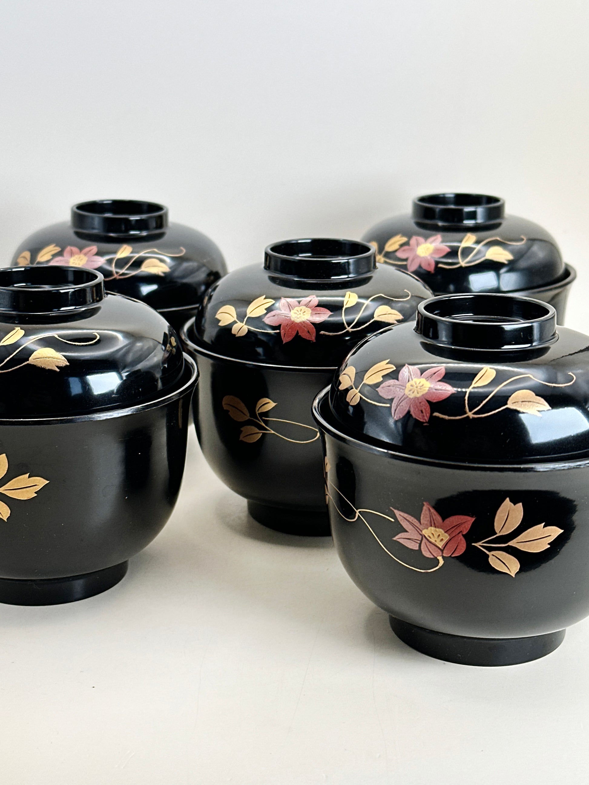 Each bowl is delicately adorned with tessen (clematis) blossoms rendered in maki-e technique. Soft pink and red petals bloom gracefully across the glossy black ground, accompanied by flowing gold vines and leaves. The subtle gold accents catch the light beautifully, creating a gentle contrast against the rich lacquer surface.