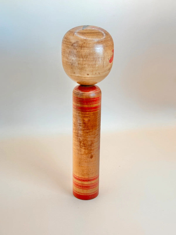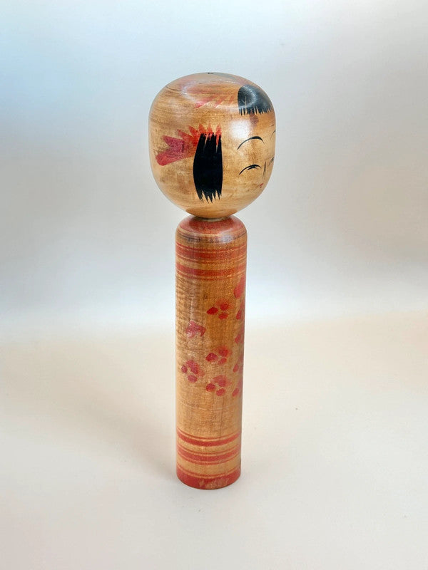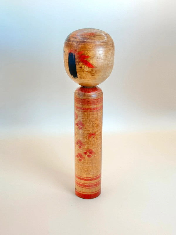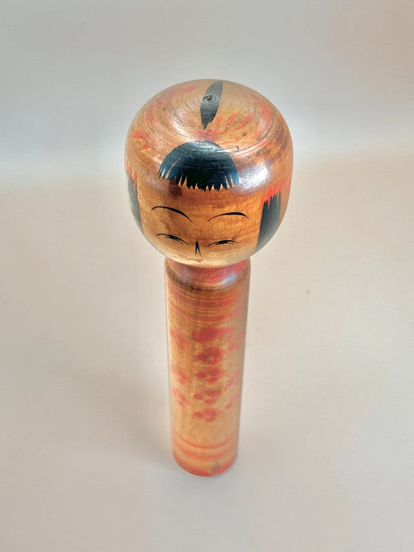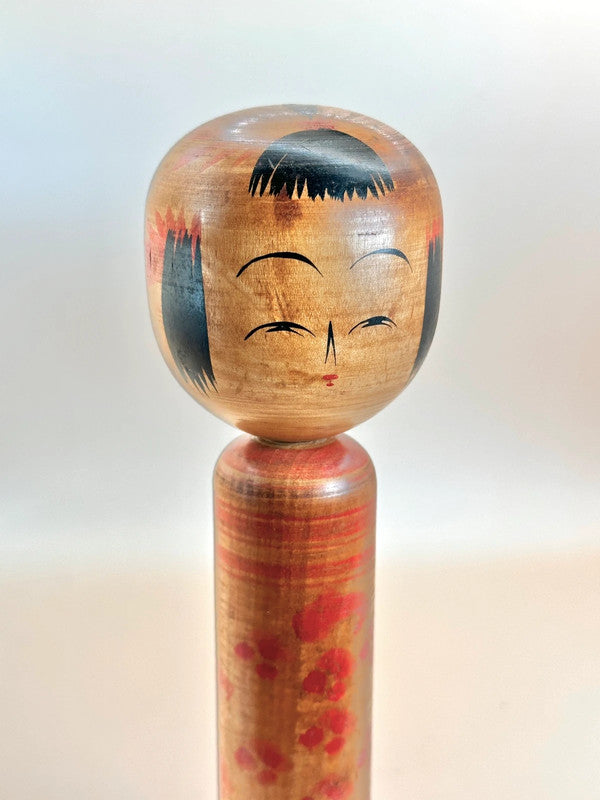 A Yamagata-style kokeshi by Seitaro Kobayashi 小林誠太郎, representation of refined folk craftsmanship from the Tōhoku region. With a tall, elegant body and rounded head, the doll is painted in warm vermillion hues and floral motifs typical of the Yamagata tradition. The surface bears a mellow sheen and natural patina from age, giving the piece a quiet dignity. Her softly rendered facial expression with almond eyes and delicate brows reflects the calm, introspective aesthetic often found in Seitaro's later works.