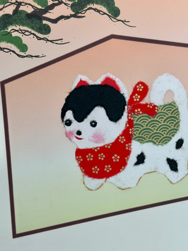 A vintage Japanese shikishi artwork card from 2006 with the orignal packaging. Features a beautifully textured chigiri-e (ちぎり絵) collage—an art form that uses torn, hand-dyed paper to create delicate and tactile images. The central subject is an adorable Inu Hariko (犬張子), a traditional Japanese paper-mâché dog, rendered here in layered washi paper with fine details and a gentle, pastel-toned gradient background.
