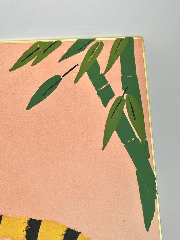 A vintage Japanese Chigiri-e Shikishi Art – It showcases a charming tiger design created using the traditional Japanese art of chigiri-e (ちぎり絵)—a collage technique using hand-torn washi paper to form soft, textured images. The composition radiates warmth and whimsy, making it a lovely representation of good fortune and protection.