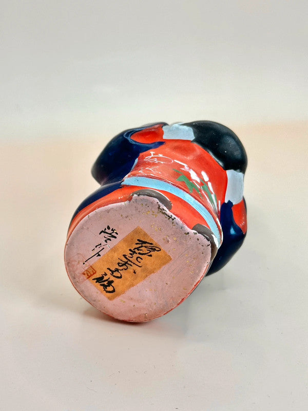 This particular piece showcases classic Showa-era craftsmanship, with bold brushwork and whimsical features that give it warmth and character. The detailing on the kimono includes motifs of bambo leaves, adding a seasonal and festive touch. The base is signed and stamped, indicating it was produced by a regional folk pottery studio.