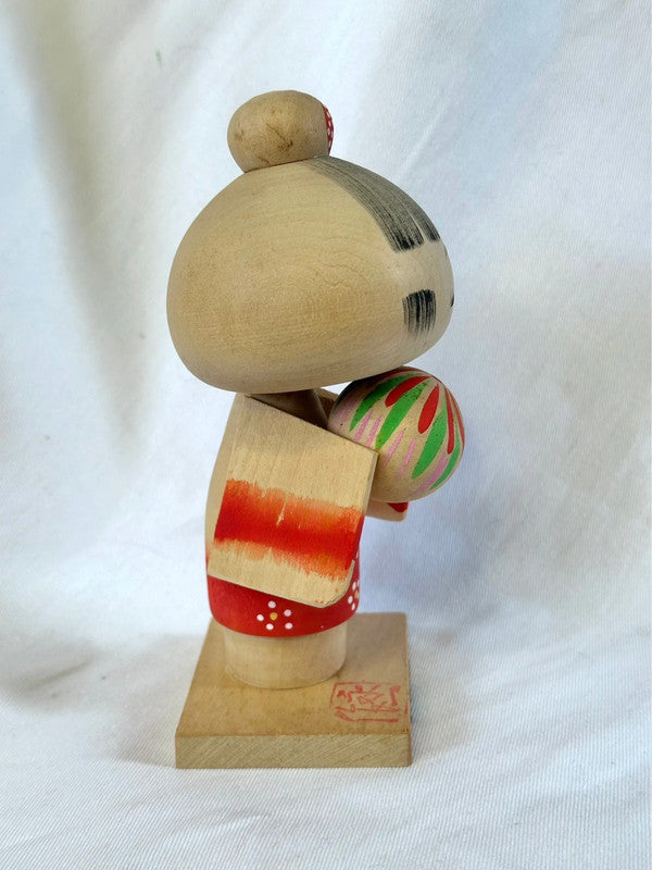 Rare Sosaku kokeshi doll by Eiichi 永一 “Little girl with her temari” (手毬) balls are a folk art form and Japanese craft, used in handball games and other such similar games (e.g., hacky sack).