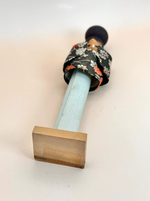 A vintage sōsaku kokeshi doll stands tall with a refined silhouette and an air of quiet grace. Unlike traditional all-wood kokeshi, this piece is beautifully adorned with a real fabric kimono, adding a layer of texture and authenticity to its aesthetic.